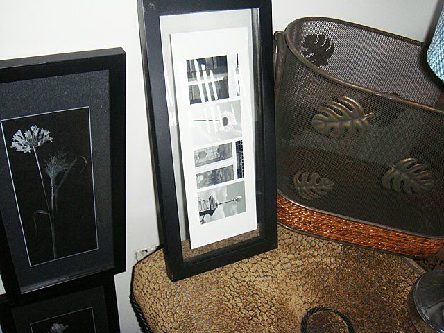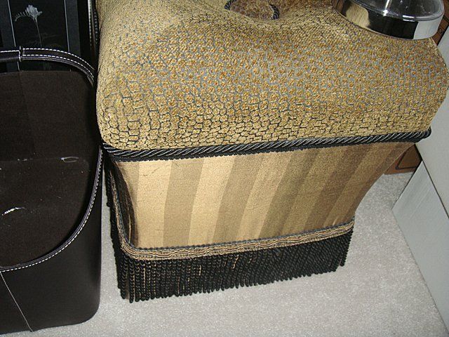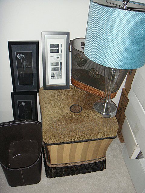 7 piece estate lot including ottoman with tassles at bottom, 3 framed decorative flower prints, leather magazine holder, and wire magazine holder and clear glass lamp.