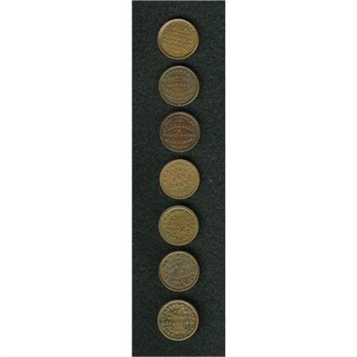<B>Septet of Michigan Civil War Merchant Tokens.</B></I> Seven Michigan Civil War merchant tokens, Fuld-<B>MI5F-2a, R.4; MI225A-3a, R.3; MI225AO-3a, R.7; MI440A-1a, R.6; MI530E-3a, R.5; MI610B-3a, R.8; </B></I>and <B>MI700A-1a, R.5.</B></I><BR><BR><b>Shipping:</b> Coins & Currency (<a target="_blank" href="http://www.heritageauctions.com/common/shipping.php">view shipping information</a>)