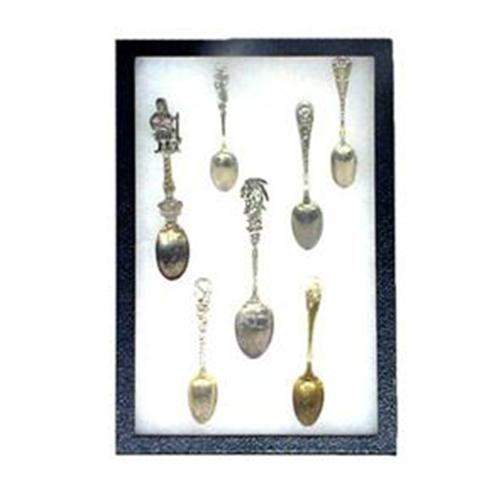 7 pc collection souvenir spoons. One large figural souvenir spoon which appears to be silver on copper AOHNAI that is a large spoon. The next little demitasse spoon is sterling silver and it says Fort Defiance 1794 on the bowl. The central spoon is a large Indian head figural spoon that says Niagara Falls and there you have Niagara Falls. This spoon is marked Sterling. Demitasse spoon to the bottom left has an incredible pattern marked TOLEDO (I guess for Toledo, Ohio). That spoon is marked sterling with fancy letters in script on the back of RW&S. To the bottom right a wonderful spoon that is completely patriotic. It is sterling silver and marked as such with gold wash on the bowl. There is a portrait of an officer on the bowl reading ? Captain CD SICSBEE. It has the American Flag on top with a combination of gold and silver wash ? I?m not sure if the spoon is sterling it is marked only - Standard. To the right of the Indian spoon there is a wonderful sterling silver spoon from the Worlds Fair it reads ? Columbus 1492-1892. It is a real nice spoon. The top right spoon is also sterling silver and it reads ? Detroit in the bowl inscribed to MAMMA on the front and inscribed From Edna on the back. A really nice lot of highly collectible souvenir spoons. This is a very good start if you are just starting ? these are nice spoons almost making me want to start collecting them. They come in this butterfly box so you will have an instant display when you get them.