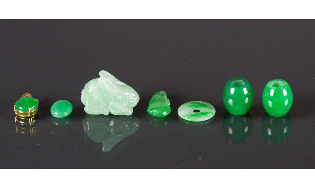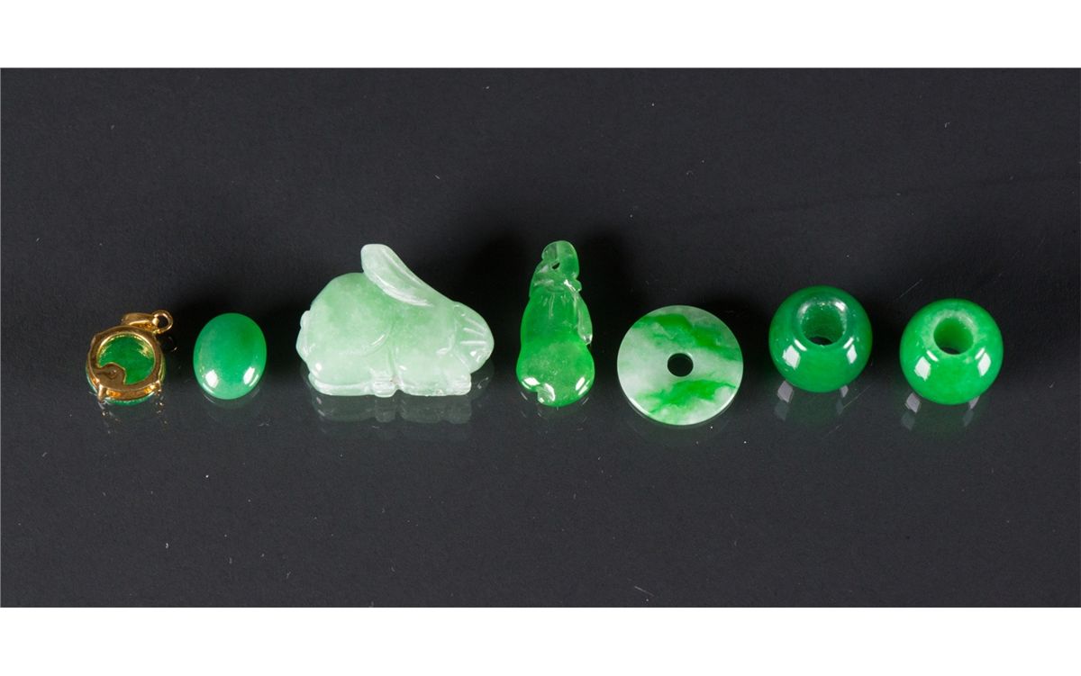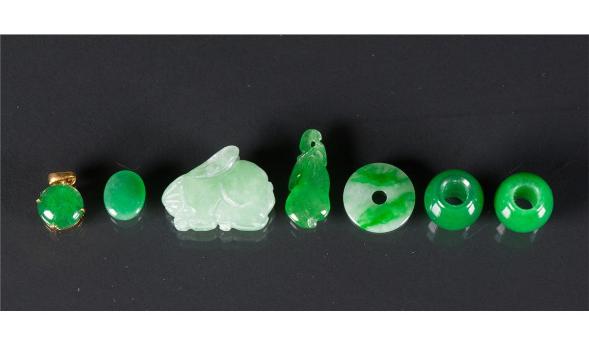 Seven pieces of Chinese green jadeite and hardstone pendants; comprised of two emerald green beads, one lucky buckle, one carved rabbit figure and three carved pendants; Biggest H: 1.8 cm, W: 2.5 cm, 7 grams