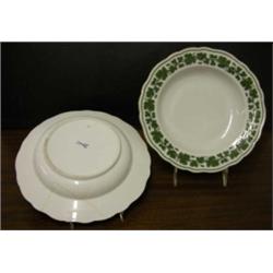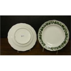 7 Pieces of Meissen Dinner Ware, early 20th century. Ivy leaf border with crossed sword mark on bottom. Includes 2 bowls (9 1/2" in diameter) 2 plates (7 3/4" in diameter), and 1 plate (9" diameter), 2 plates (9 1/4 in diameter).