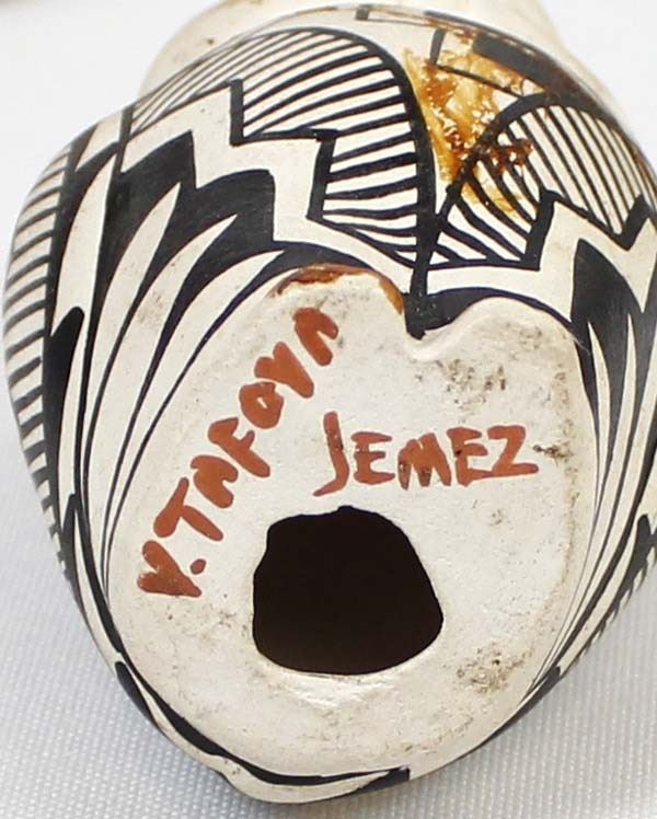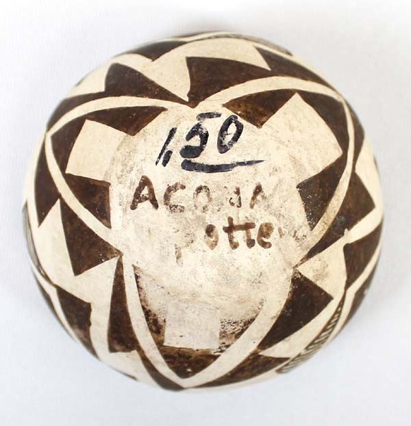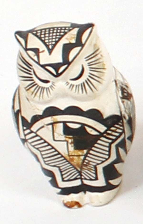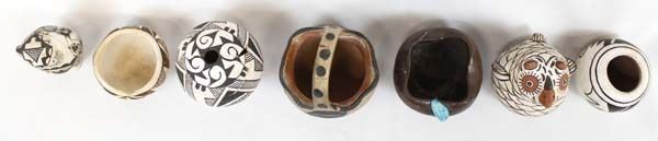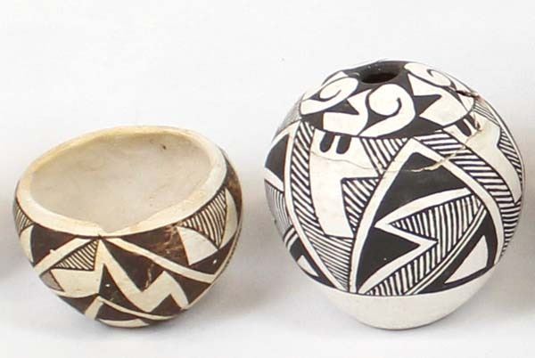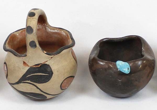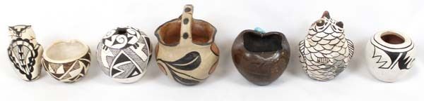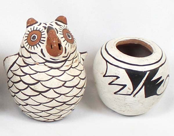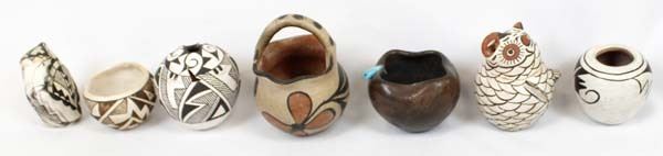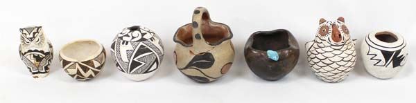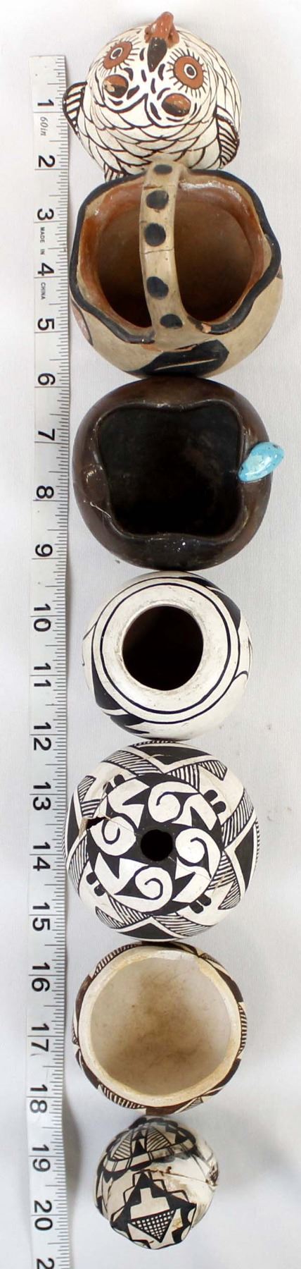 7 Pieces of Native American Pottery, all are damaged and in need of TLC, includes 1. Santa Clara Pottery Basket, largest measuring 4.5'' x 3.5'' x 3.25'' 2. Zuni Pottery Owl 3. Acoma Seed Jar 4. Acoma Bowl 5. Santa Clara Pottery Bowl w/ Turquoise Cabochon 6. Laguna, Taos and Jemez Pueblo Pottery Bowl by Alma Loretto Concha (b. 1941), no damage 7. Jemez Owl by Vangie Tafoya