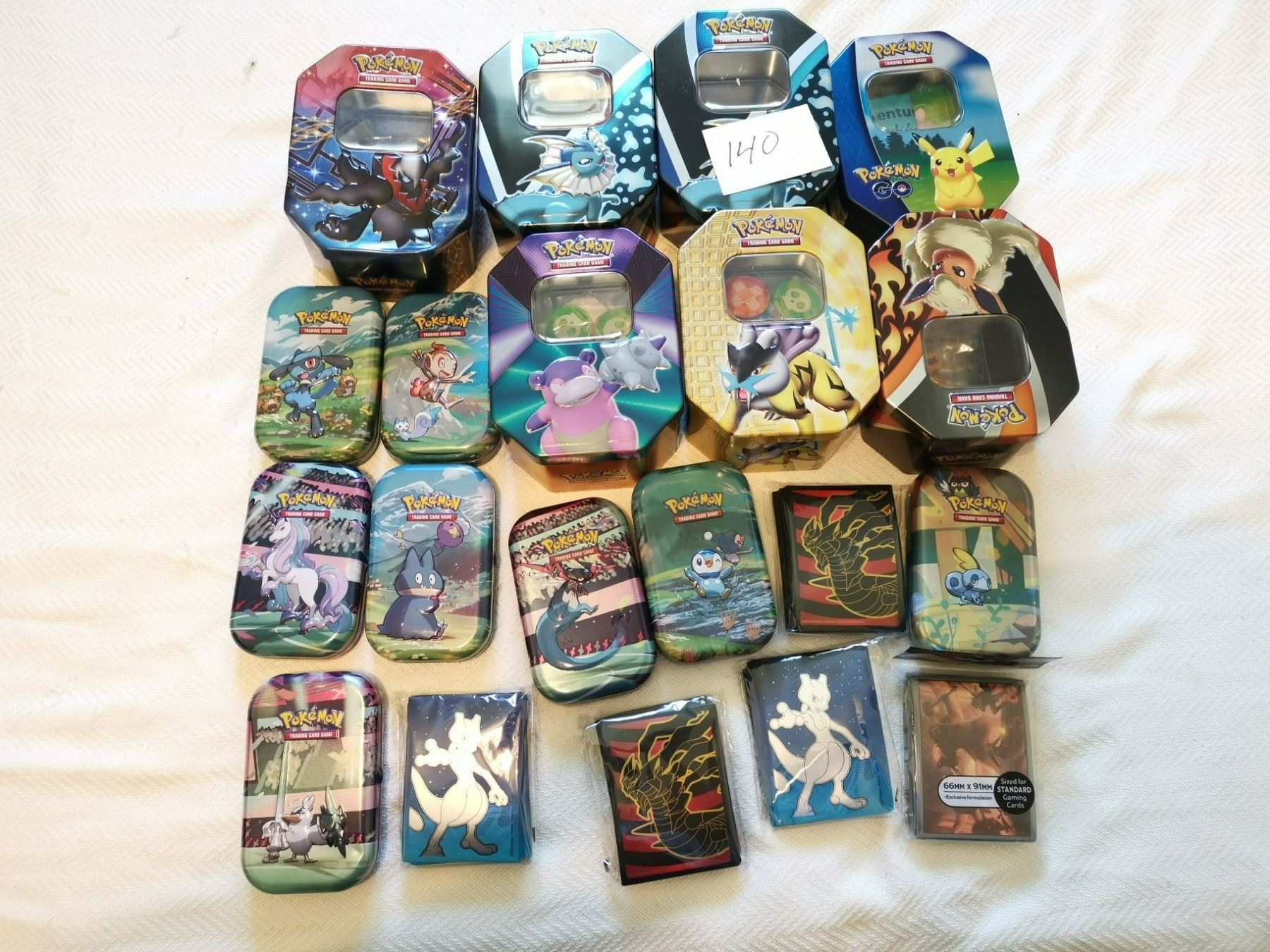 7 Pokeman tins with games 7 empty tins 5 packs sleeves