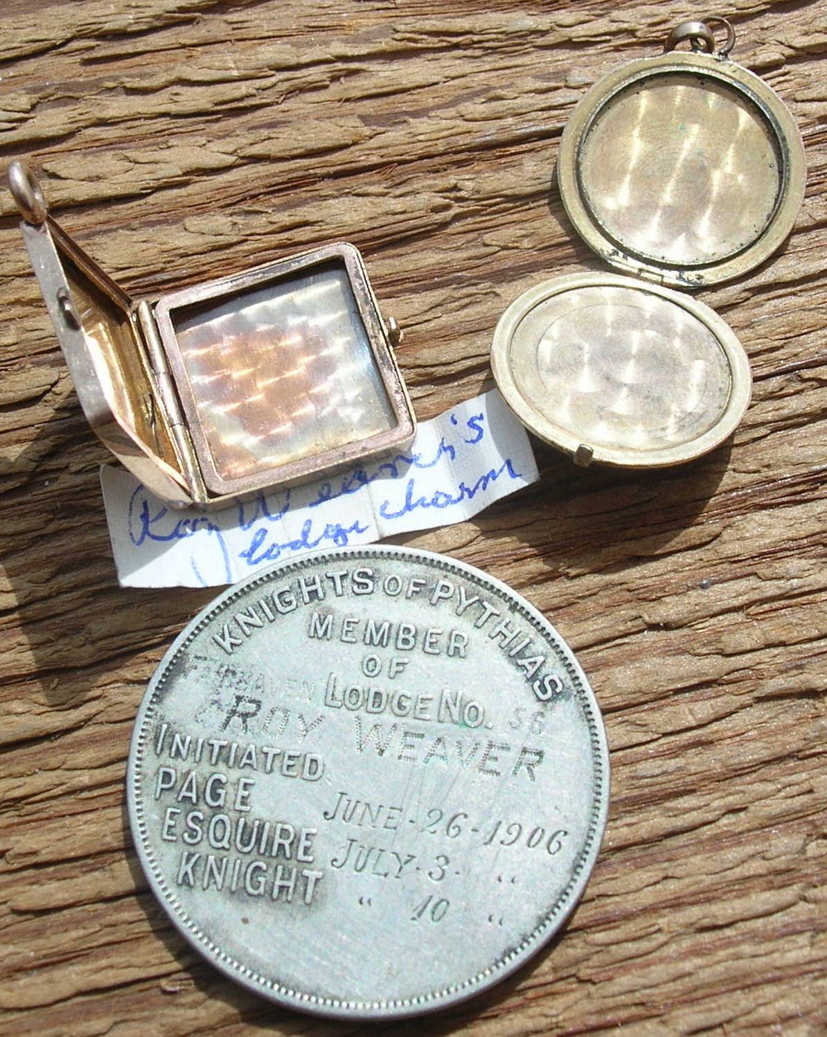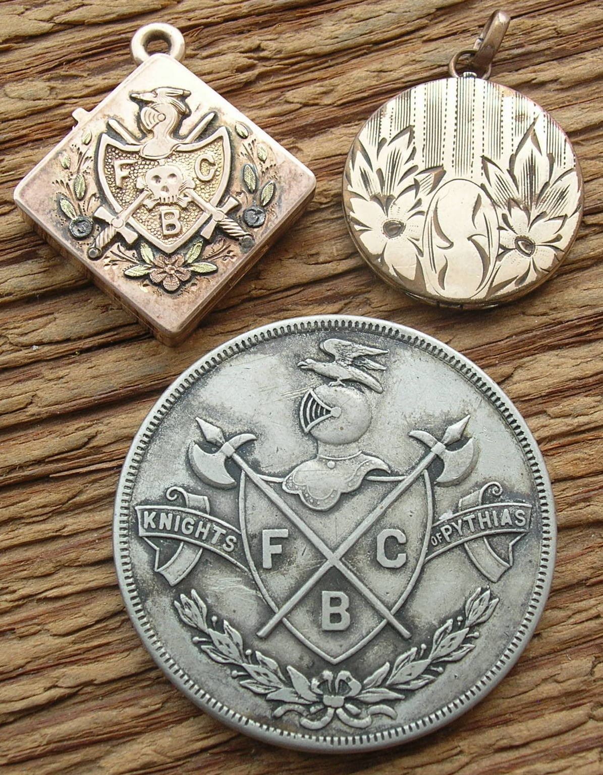 There are two nice early 1900s gold plated engraved lockets, one of which is a official Knights of Pythias locket, the other has floral designs hand engraved on it.