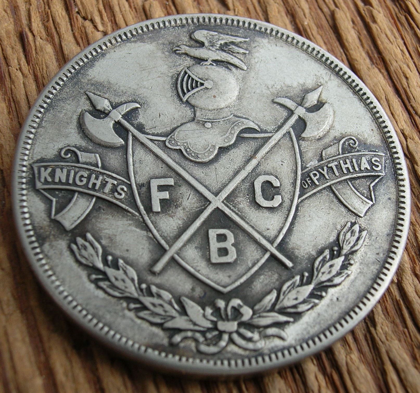The nickel medallion shows on the obverse the official K of P logo design of Helmeted Knight with eagle on top, above a shield flanked by cross broadsword axes, and the letters within those areas on the shield divided by the handles, F / C / B
