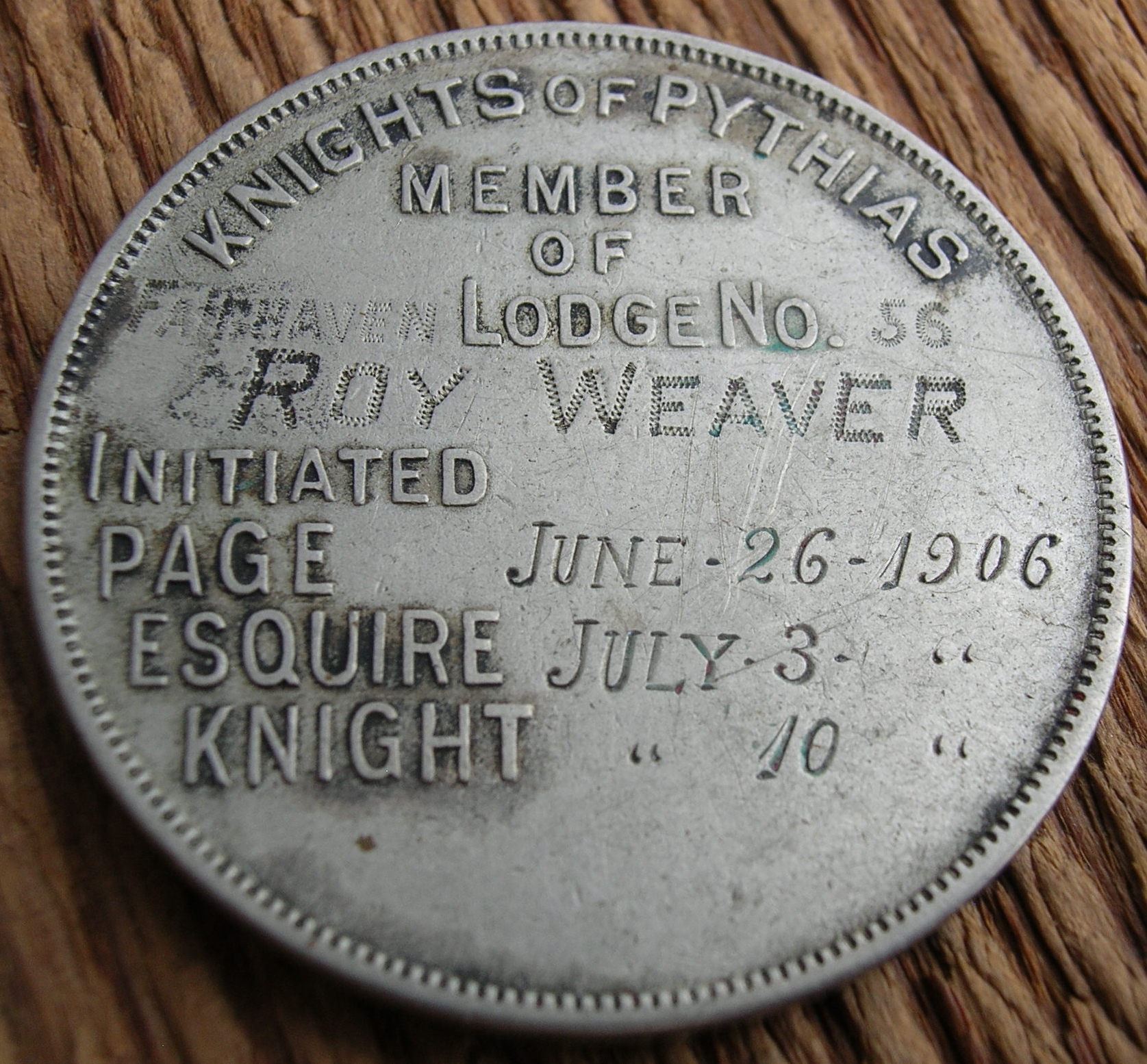 KNIGHTS OF PYTHIAS / MEMBER / OF / FAIRHAVEN LODGE NO. 56 / ROY WEAVER / INITIATED / (Blank) / PAGE JUNE 26 1906 / ESQUIRE JULY 3 / KNIGHT 10
