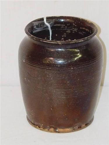 7" REDWARE JAR W/ TOOLED DECORATION - PITTING & LOSSES TO GLAZE, SMALL RIM CHIPS;