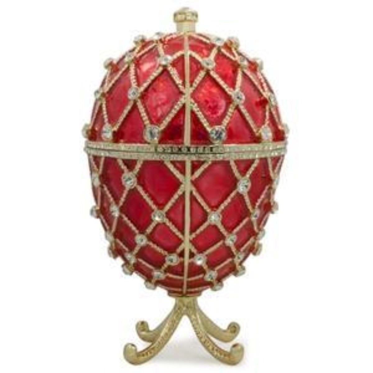 7" Royal Trellis on Red Enamel Jeweled Faberge Inspired Egg Give a boost to aesthetics of your living room with the 7" Royal Trellis on Red Enamel Jeweled Faberge Inspired Egg. Enameled and jeweled, this Faberge Inspired Egg is fashioned from fine pewter and is set with genuine crystals. It mounts beautifully on a set of four curved legs stand. 7'' (H) Pewter, Crystals, Enamel Gift Boxed