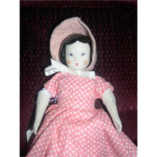 7" Ruth Gibbs with Pink dotted Dress and matching pantaloons. I listed her under pre 1930's as thee isn't a category for later made china dolls. Ruth Gibbs china dolls were made in Flemington, N.J. in the 1940-1950's. She has her pink felt bonnet. She has a white cotton body and has the white china parts. She has black hair and gold slippers. She has a paper label in the back of her skirt that identifies her as Play Friend No. 400 P. Doll comes from a smoke free environment. Buyer to pay $10 for shipping, handling, and insurance. Thanks for viewing.