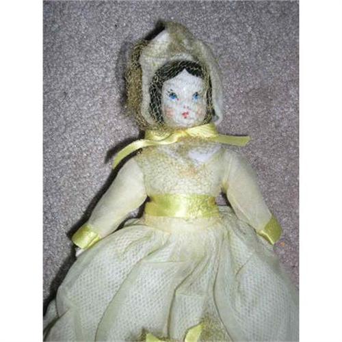 7" Ruth Gibbs Susan in Yelllow. She is called a name doll and the little girl requested Susan to be written on the front. These were special order dolls for the chil's name. She is the white china with the black hair and black shoes. The net on the bonnet may have some tears. Doll comes from a smoke free environment. Buyer to pay $10 for shipping, handling, and insurance. Thanks for viewing.