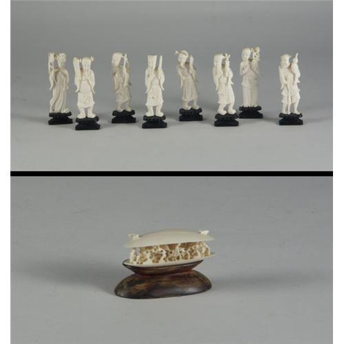 IVORY: Eight carved ivory figurines depicting eight sages, mounted upon dark wood stands, 4'' H; shell-form carving with interior village scene with wood stand, note chip, 3'' L. All mid-20th c.