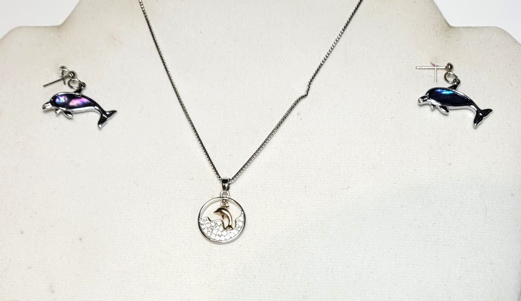 PENDANT ON 18" CHAIN AND STUD DROP EARRING WITH ABALONE DOLPHIN SHAPES. JEWELLERY
