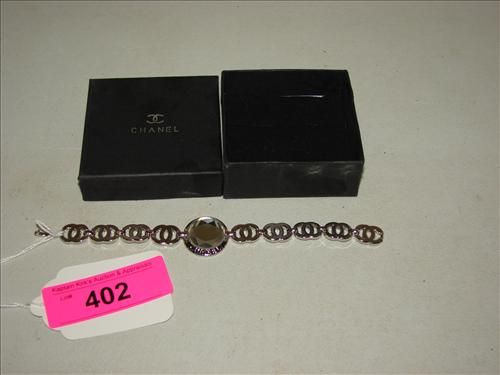 7" SILVER-TONED BRACELET SIGNED CHANEL. GEMSTONE OFF CENTER. AS SHOWN. VIEW PICTURE FOR DETAIL.