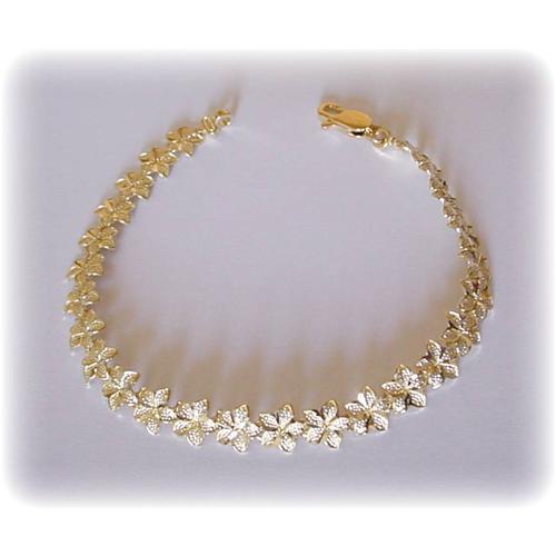 Highly detailed Plumeria Flowers are linked in this Classic Hawaiian Design! Stunning bracelet is made of brilliant, solid 14 Karat Yellow Gold. 7 inches long. Lobster Clasp