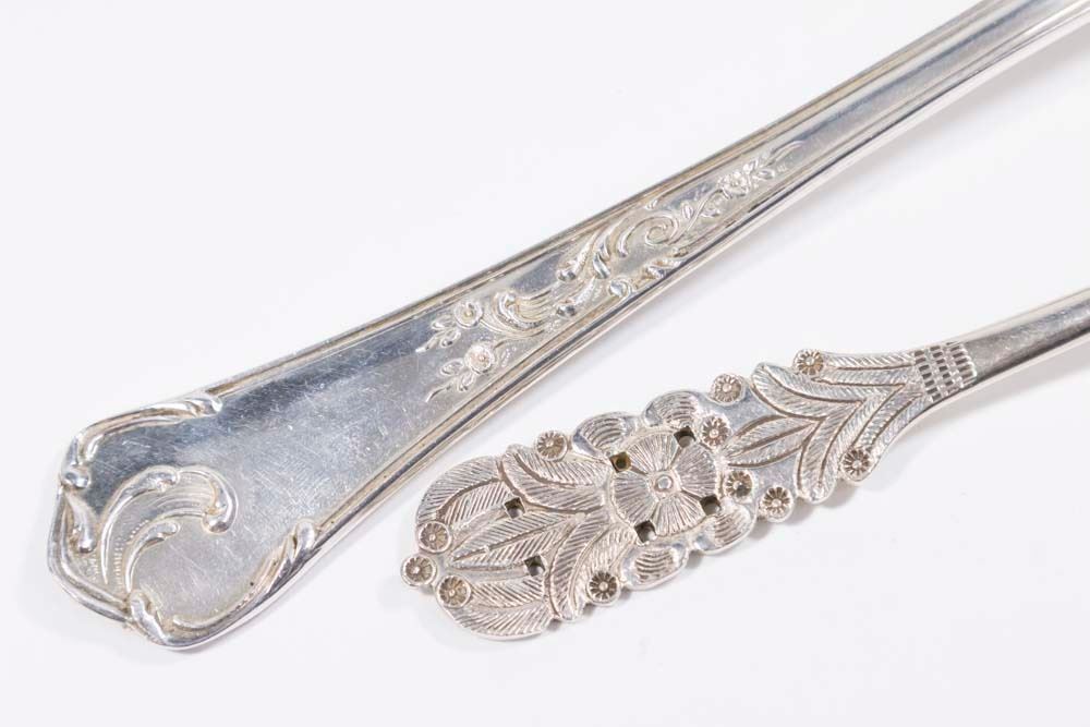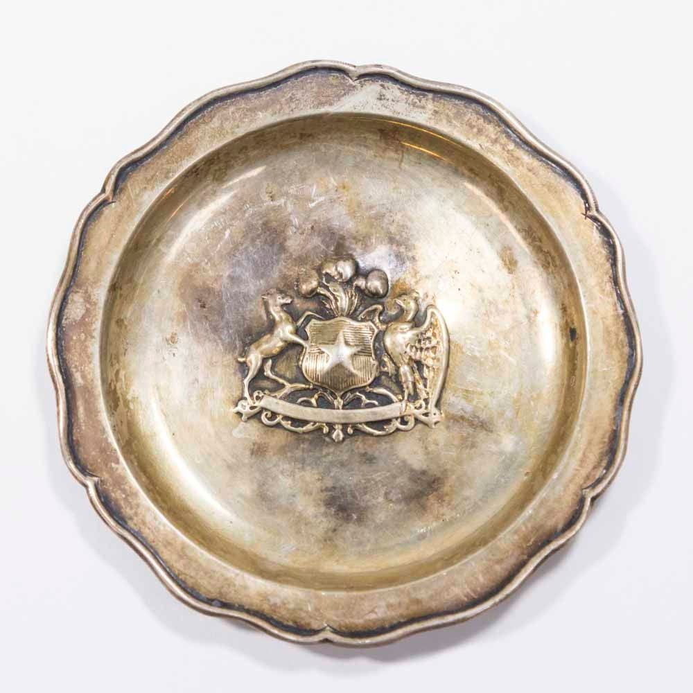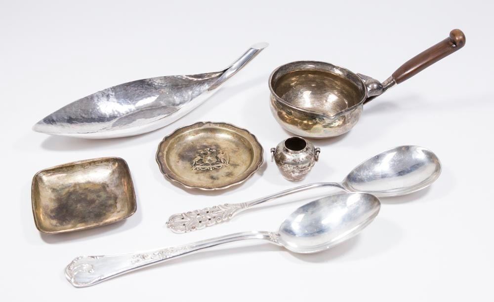 Including 2 serving spoons, approx. 9 3/4" L; porringer with wood handle; leaf dish, approx. 10 1/4" L; 2 small dishes; and miniature vase. Total weight approx. 20 ozt. (6011)