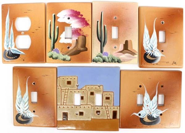 7 Southwestern Decorative Ceramic Switch and Plug Plates, measure 4.75'' x 5.25'', initialed by the artist