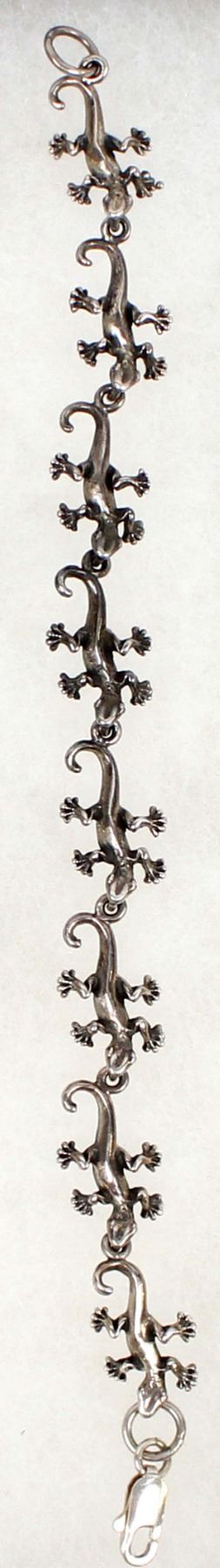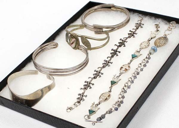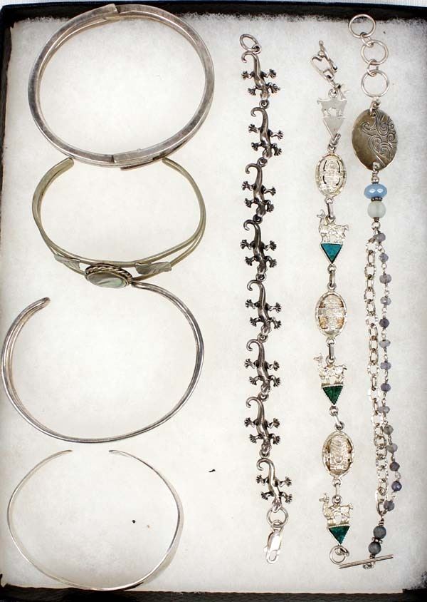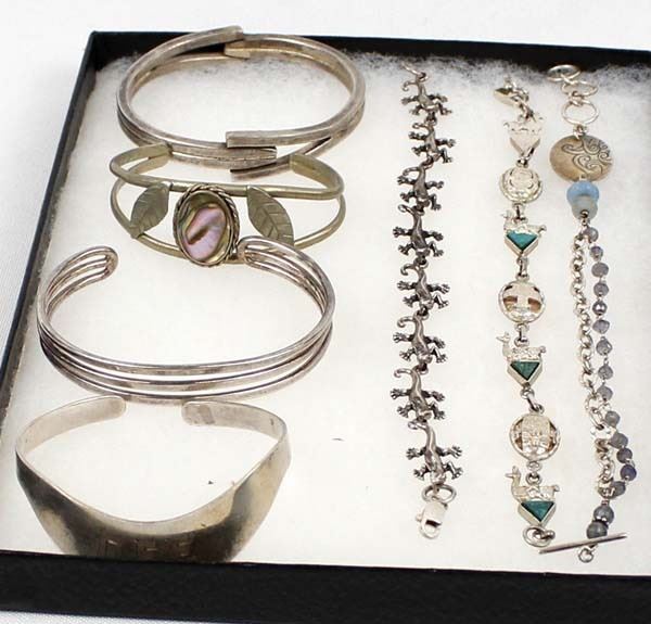 7 Sterling Silver Bracelets, includes 1. Monogrammed Sterling Cuff Bracelet, stamped .925 2. Three Band Cuff, not marked however I believe it is sterling 3. Abalone Cuff Bracelet, unknown if sterling 4. Mexican Sterling Hinged Bracelet, stamped Mexico .925 Sterling 5. Sterling Silver Lizard Link Bracelet, clasp stamped .925 6. Peruvian Sterling Llama Link Bracelet, stamped .925 7. Psalm 46:10 Be Still Bracelet, unmarked, longest measures 8''L end to end
