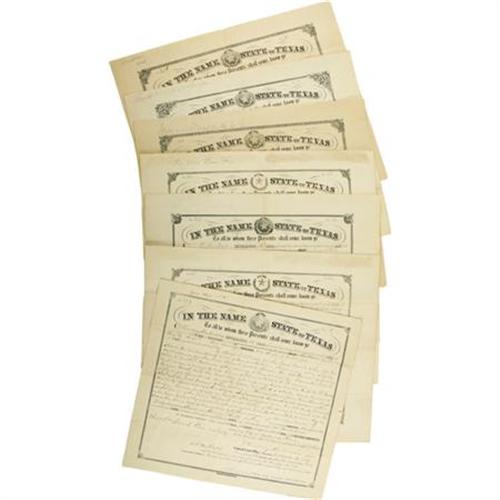 <B>Texas Governors</B></I> Group of seven land grants dated from 1876-1900 signed by Governors of Texas, each measuring 17" x 14". Includes: A secretarially signed <B>J. Pinckney Henderson</B></I>, although the grant was originally given on July 3, 1847, this document is dated and filed at the Austin General Land Office on Sept. 30, 1887; <B>Richard Coke</B></I>, Austin, April 26, 1876; <B>Joseph D. Sayers</B></I>, dated May 3, 1900; <B>O.M. Roberts</B></I>, Austin, Nov. 3, 1882; <B>R.B. Hubbard</B></I>, Austin, May 30, 1877; and <B>John Ireland</B></I>, Austin, Sept. 29, 1883. Overall condition if very good to near fine, with light folds and collectors notations in pencil at top and bottom margins.<BR><BR><b>Shipping:</b> Flat Material, Large (<a target="_blank" href="http://www.heritageauctions.com/common/shipping.php">view shipping information</a>)