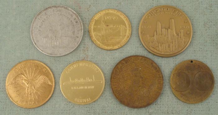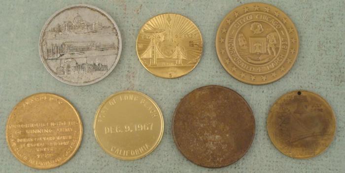World's Fair Colorado BuildingSan Francisco International Exposition, 1939, China ClipperChicago Fire Centennial, 1971Club Aluminum Victory medal, 1929RMS Queen Mary arrival, Long Beach CA 1967United We Stand for Freedom, 1945Pennsylvania State Sabbath Schools Association 66th annual convention, 1928 (hole at top)