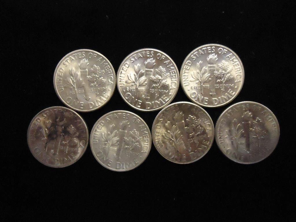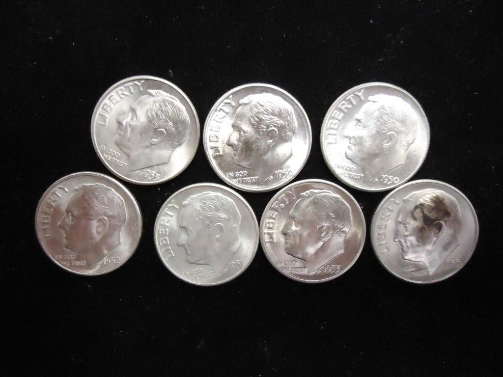 7 UNC SILVER ROOSEVELT DIMES DATES FROM 1950-55