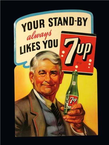 7-UP Die cut cardboard sign, easel back. Wrinkle upper right otherwise mint condition. 12 X 18 1/4 inches.