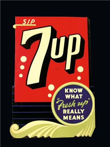 7-UP Die cut cardboard sign, easel back, lithographed in Canada. Mint condition. 13 1/2 X 19 1/2 inches.