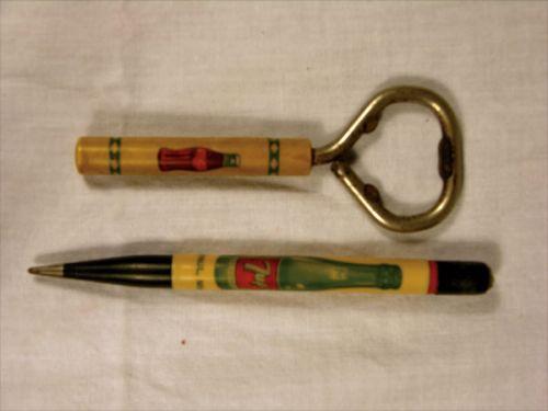 7-UP Eversharp, missing pocket clip and Coca Cola Bottle Opener with celluloid handle. Both in very good condition.
