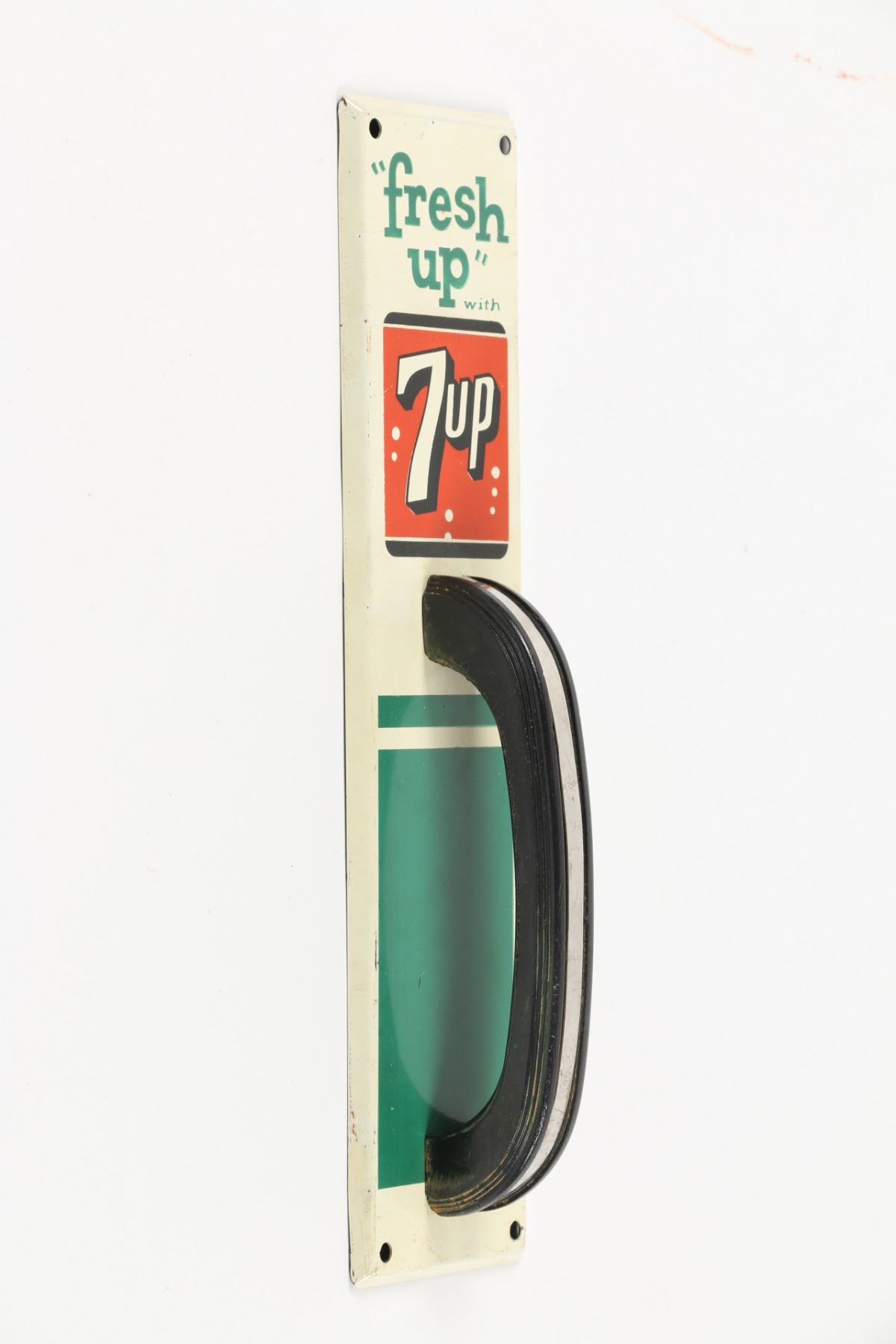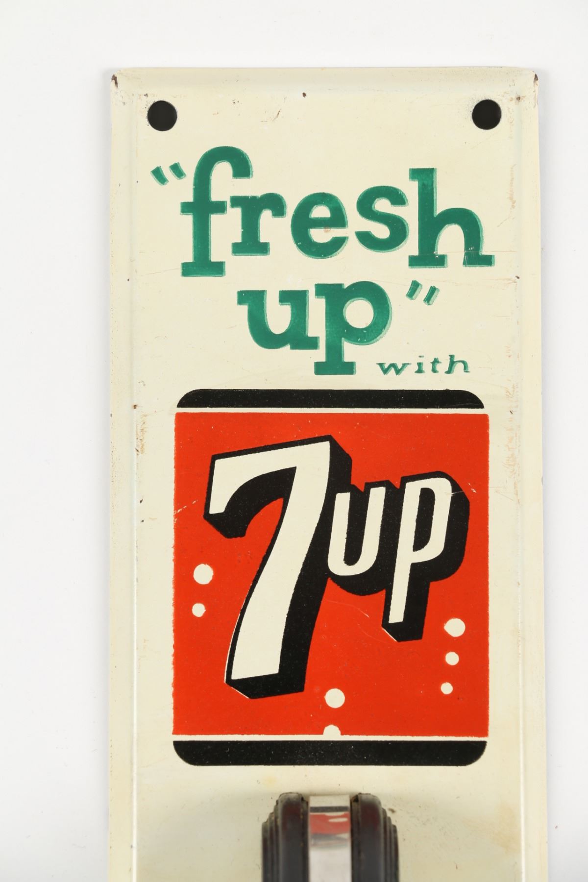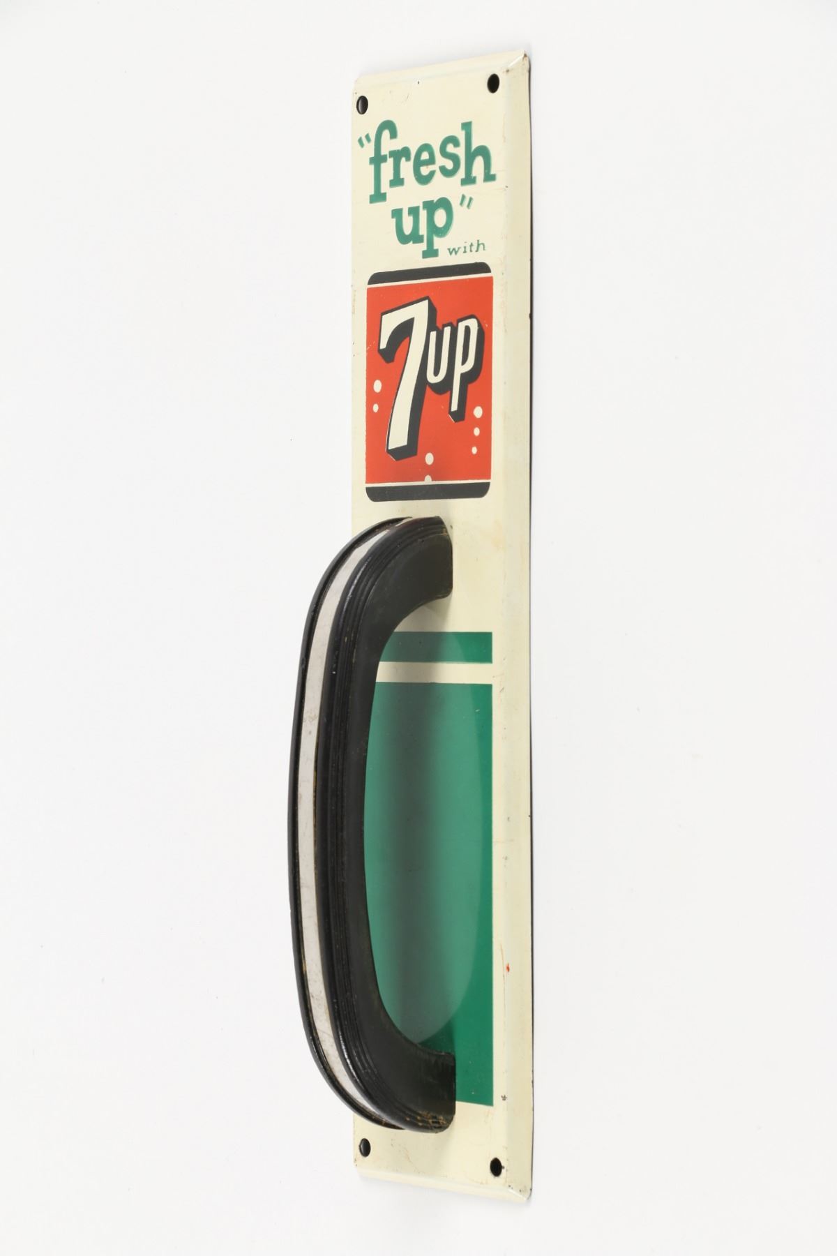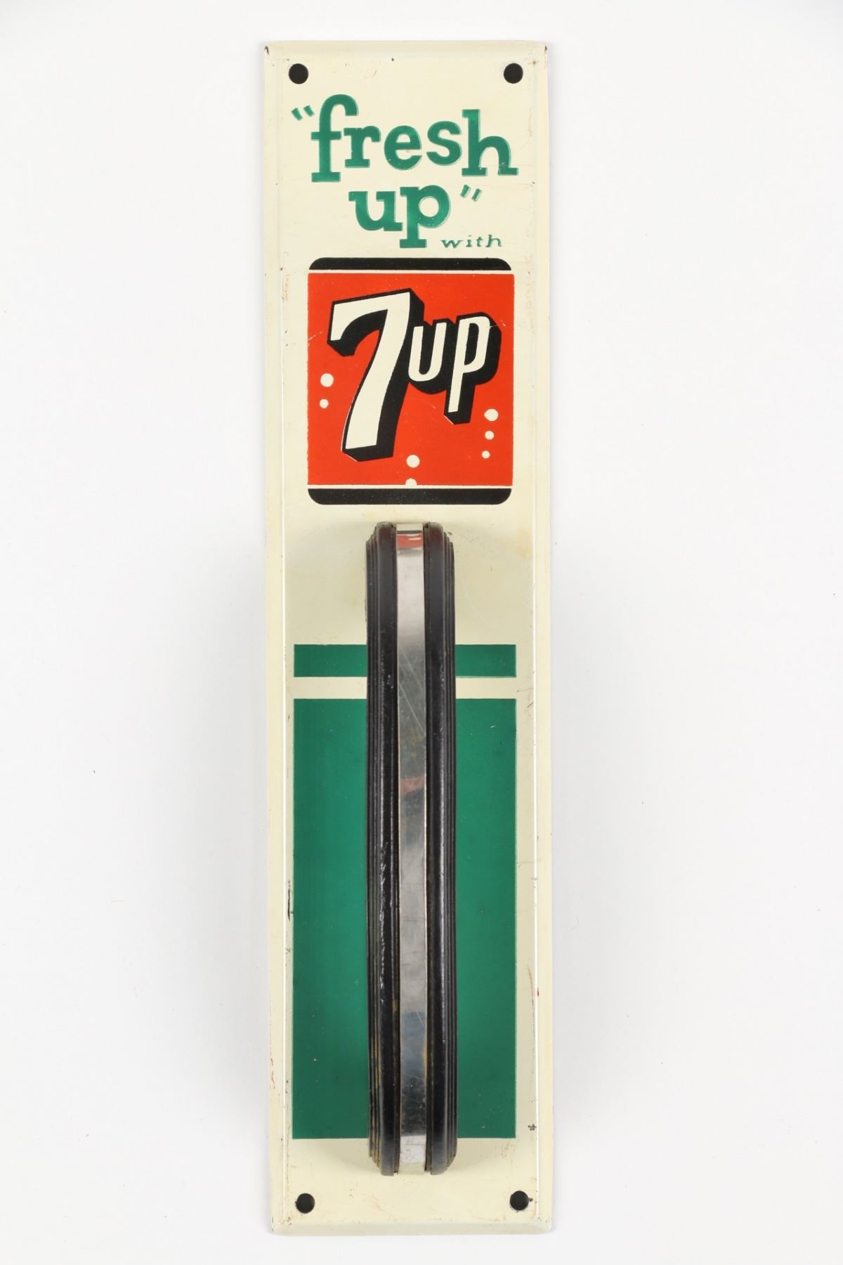 American. Circa 1950. Lithographed tin base plate with chrome-strip handle. 11.75" x 2.75". Minor scuffs, scratches. $200-300.