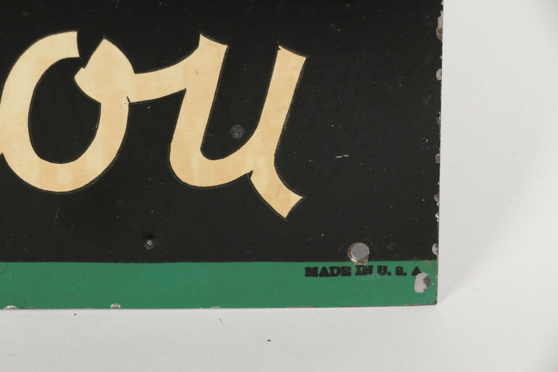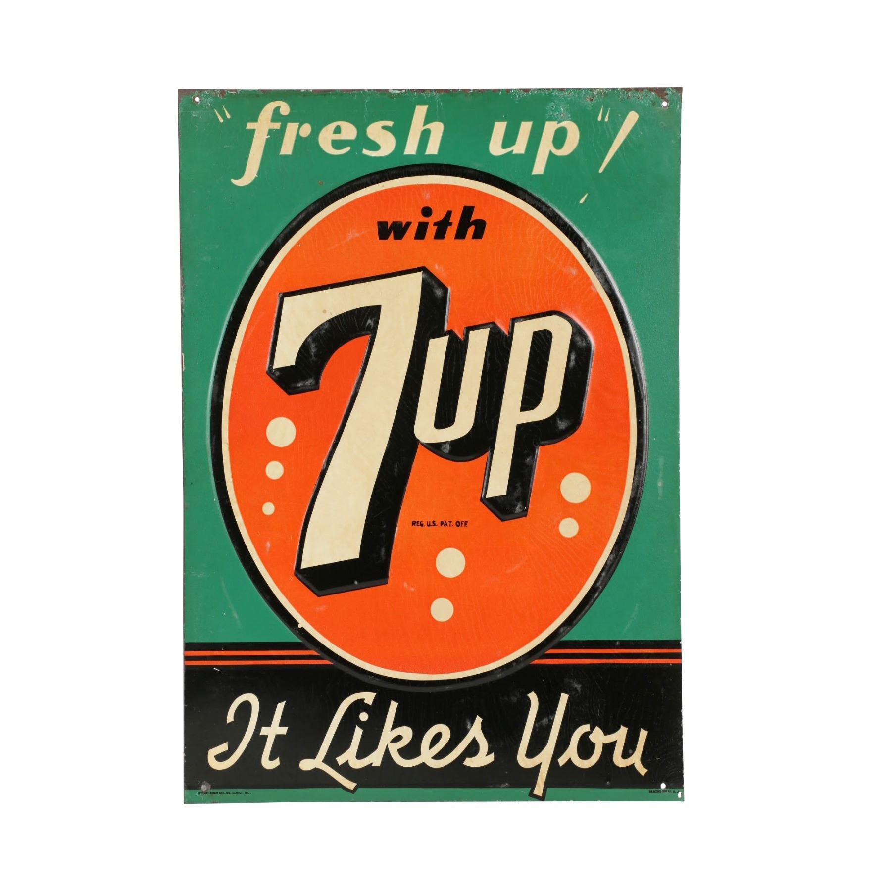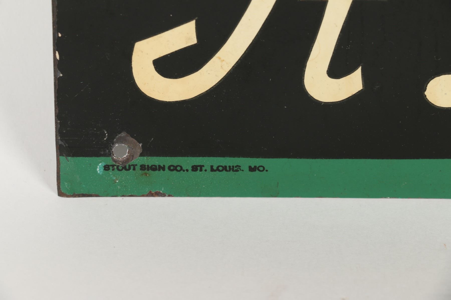 American. Circa 1950. Embossed, lithographed tin. Marked "Stout Sign Co - Made in USA", lower edge. 19.5" x 13.75". Minor wear along upper edge. Surface exhibits minor paper acid transfer from storage. $300-500.