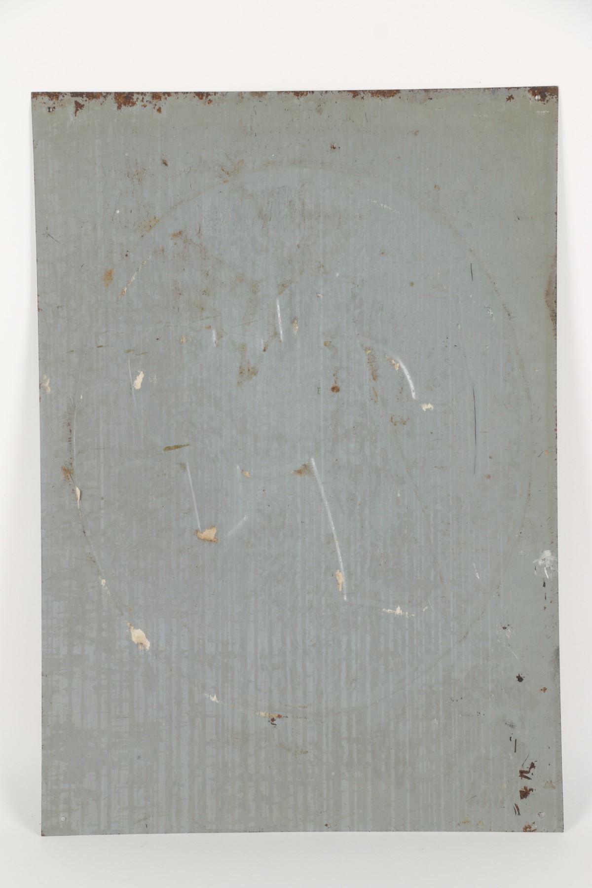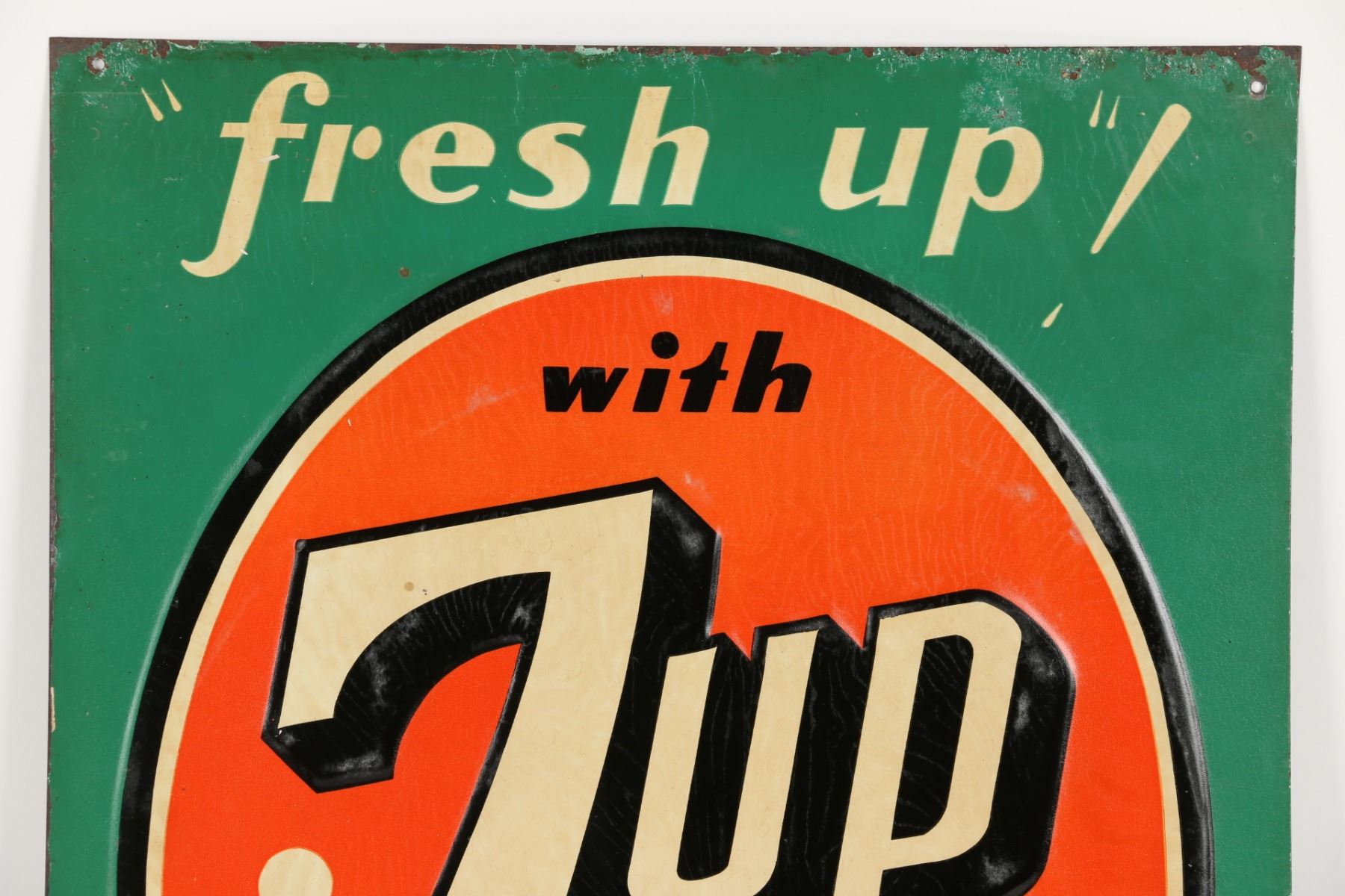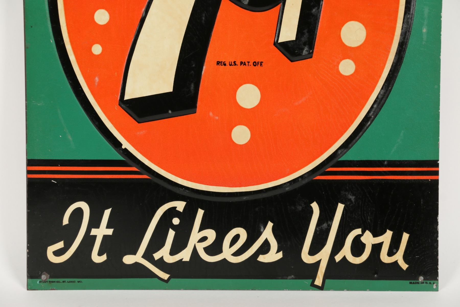 American. Circa 1950. Embossed, lithographed tin. Marked "Stout Sign Co - Made in USA", lower edge. 19.5" x 13.75". Minor wear along upper edge. Surface exhibits minor paper acid transfer from storage. $300-500.