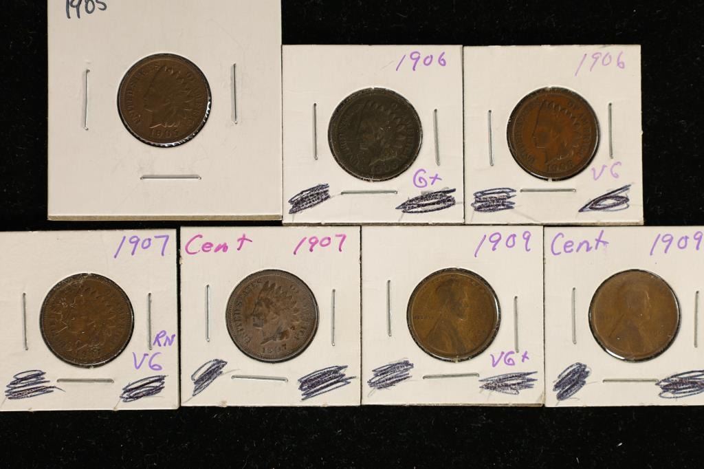 1907 AND 2-LINCOLN WHEAT CENTS BOTH 1909. THE 1905 INDIAN HEAD CENT IS EXTRA FINE-AU