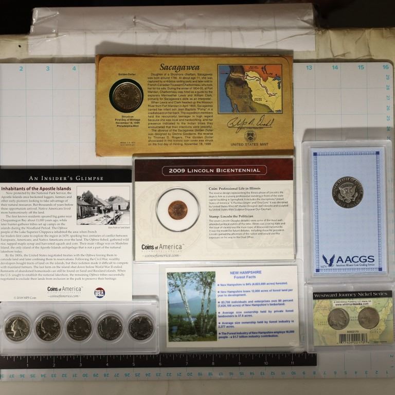 BICENTENNIAL #3 OF 4 COIN AND STAMP IN HARD PALSTIC CASE, WESTWARD JOURNEY NICKEL SET FEATURING A NO DATE BUFFALO NICKEL AND A 2005-P UNC JEFFERSON NICKEL IN HARD PLASTIC CASE, UNIVERSITY OF NEW HAMPSHIRE 2000 STATE