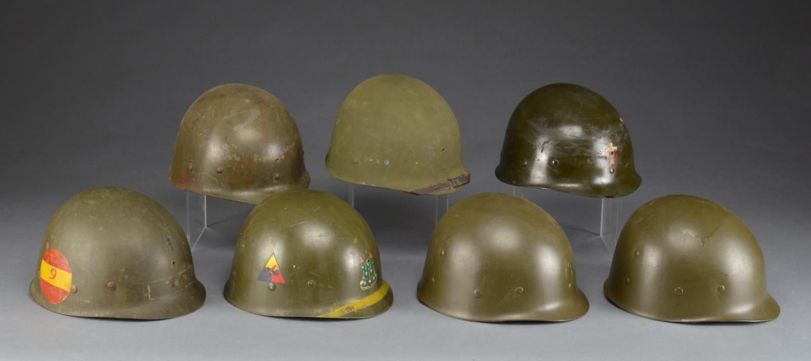 This group of WWII era liners all have a front central vent hole. 4 Of the liners have a plain green finish. 1 Has a red & yellow circle on the left & right sides w/ a “9” in the center. 1 Liner has a white cross superimposed on a red diamond on the front of the liner. The last liner has a military crest on the front & left side w/ an armored division insignia on the right side. CONDITION: liners generally show light wear. A couple, particularly the chaplain example, show more significant wear to the interior. (02-13974/BF). $400-700.