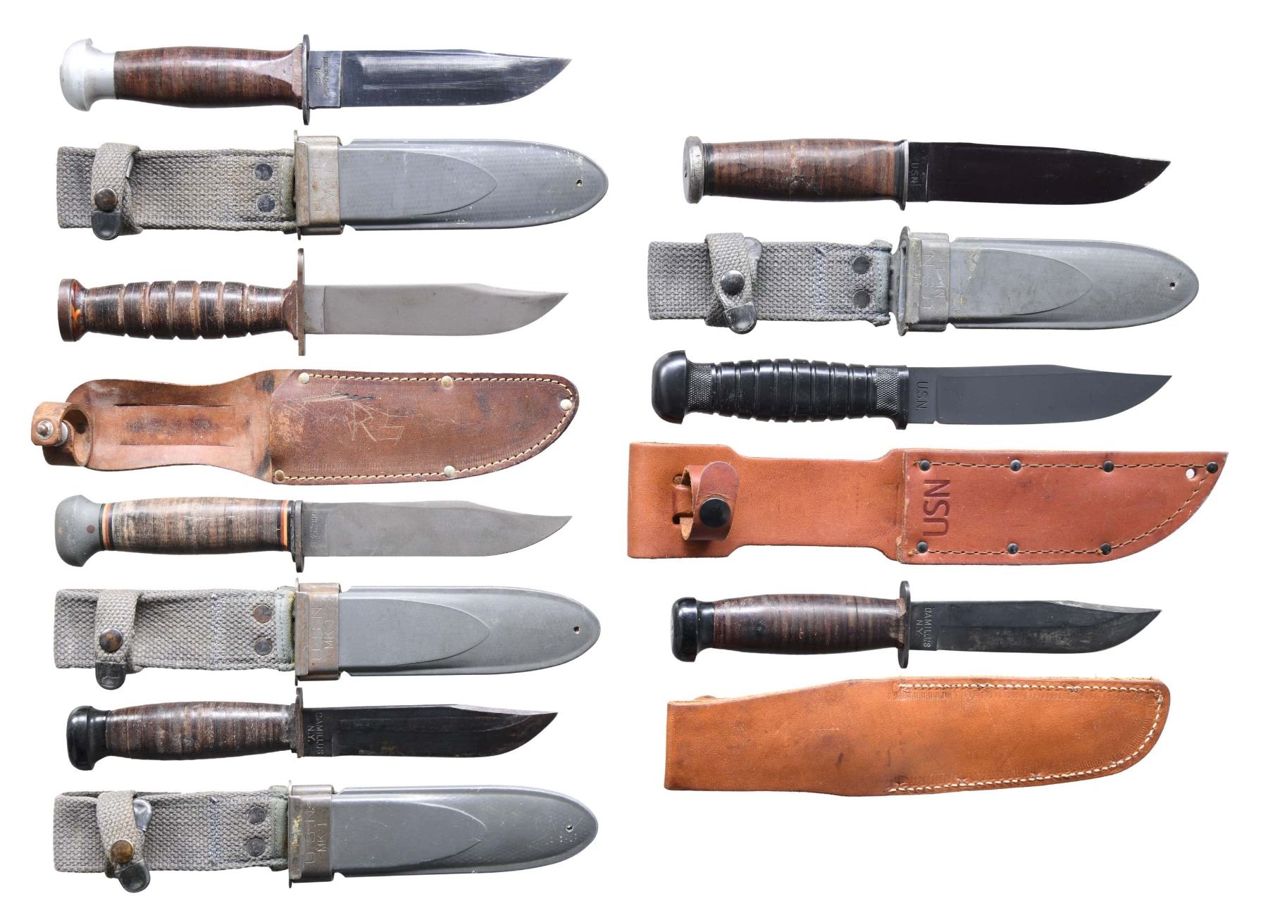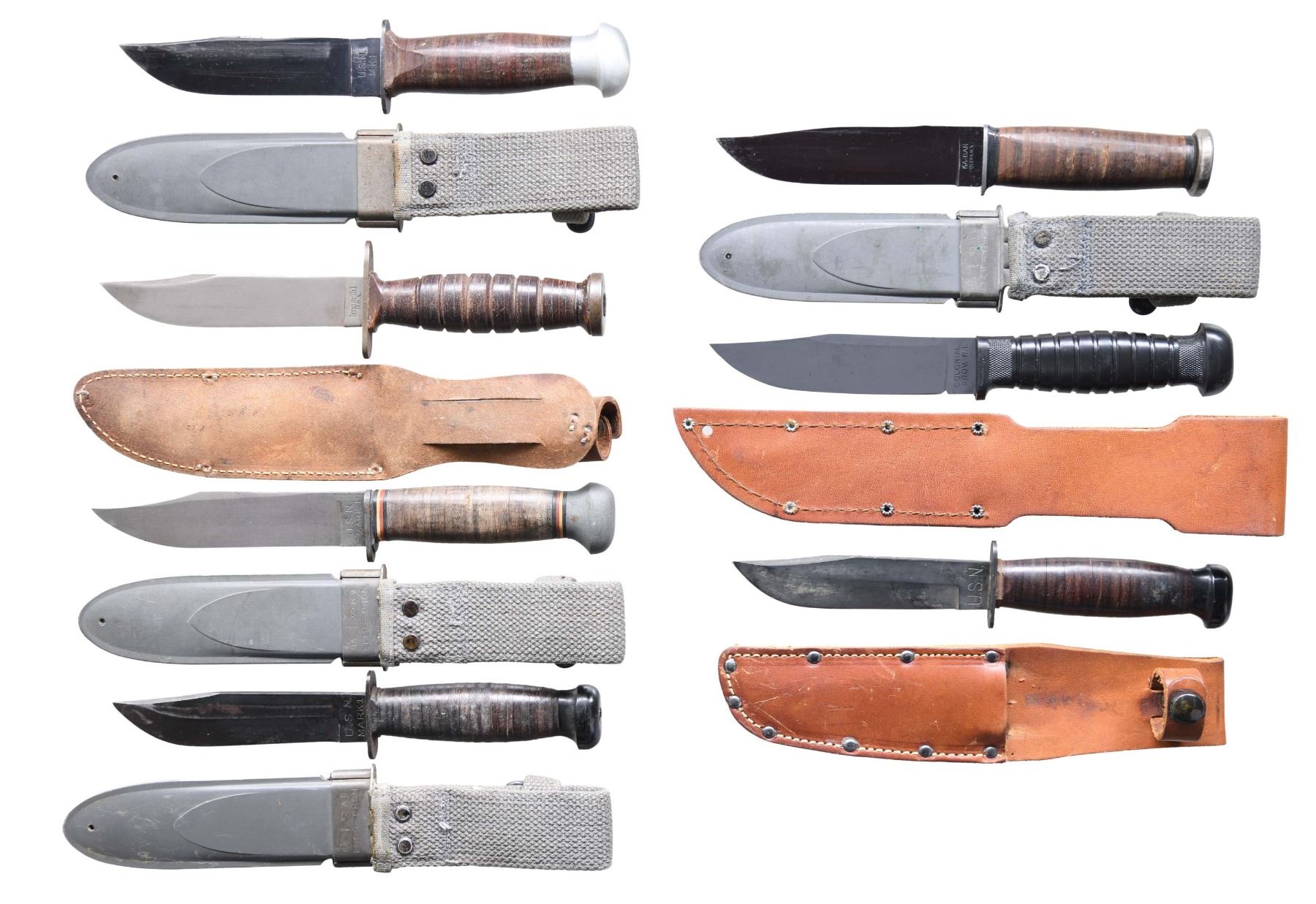 No.1: CAMILLUS Knife. 5" parkerized blade. 9 3/4" overall. Left ricasso marked "U.S.N.". Right ricasso marked "CAMILLUS / N.Y.". Straight steel crossguard. Leather washer handle. Bakelite pommel w/ screw attachment. Unmarked tan leather sheath w/ stitched & riveted construction. CONDITION: blade has moderately worn original parkerized finish. Blade has been lightly sharpened. Leather washer handle has light wear & staining. Sheath has light wear, staining & handling marks. Stitching is tight. No.2: Colonial Knife. 5 1/4" parkerized blade. 10 1/16" overall. Blade marked on left ricasso "COLONIAL / PROV / R.I.". Right ricasso marked "U.S.N.". Grooved 1 piece black molded rubber handle. Tan leather sheath w/ stitched & riveted construction. Marked on front "USN". CONDITION: knife & sheath appear unissued & have only very tiny scattered handling marks. No.3: IMPERIAL Knife. 5 1/8" parkerized. 9 7/8" overall. Marked on left ricasso "Imperial / USA". Straight steel crossguard. Grooved leather washer handle. Steel disc pommel. Brown leather sheath marked only w/ faint "bored sailor" initials on front. Stitched & riveted construction. CONDITION: blade retains a large degree of original parkerized finish. Handle has moderate wear & scuffing. Sheath has light wear & staining, stitching remains tight. No.4: PAL Knife. 5 1/4" parkerized blade. 10 1/4" overall. Left ricasso marked "U.S.N. / MARK 1". Right ricasso marked w/ PAL logo & "RH35". Steel crossguard. Leather washer handle w/ red, white & black spacers. Aluminum pommel. Gray plastic scabbard marked on front "U.S.N. / MK1". CONDITION: blade has lightly worn original parkerized finish. Handle has light wear & scuffing w/ small scratches throughout. Scabbard has wear & light oxidation. No.5: Robeson Shuredge Knife. 5 1/8" blued steel blade. 9 7/8" overall. Blade is marked on left ricasso "U.S.N. / M.K.1.". Right ricasso marked "ROBESON / SHUREDGE / NO.20". Steel crossguard. Leather washer handle. Aluminum pommel. Gray plastic scabbard. Scabbard marked on front "U.S.N. / MK1". CONDITION: blade retains 60% original finish w/ scattered spots of very light oxidation. Handle has light wear & handling marks. Scabbard has light wear & staining. No.6: CAMILLUS Knife. 5" blued blade. 9 5/8" overall. Left ricasso marked "U.S.N. / MARK 1". Right ricasso marked "CAMILLUS / N.Y.". Straight steel crossguard. Leather washer handle. Black plastic pommel. Gray plastic scabbard marked "U.S.N. / MK 1". CONDITION: blade has 50% original worn finish w/ areas of very light oxidation. Blade has been sharpened. Leather handle has wear, scuffing & scratches. Scabbard has light wear & scuffing. No.7: KA-BAR Knife. 5 1/8" blued blade. 9 1/2" overall. Blade is marked on left ricasso "KA-BAR / OLEAN, N.Y.". Marked on right ricasso "USN". Straight steel crossguard. Leather washer handle. Steel disc pommel. Gray plastic scabbard marked "USN / MK 1". CONDITION: blued steel blade has light wear & scattered spots of oxidation. Leather handle has wear, scuffing & staining. Scabbard has light wear & staining. (02-23705/RW). NON-GUN. $600-900.