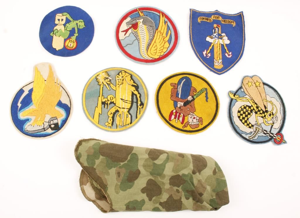 Helmet Cover. (3) Army Air Corps Squadron Patches. They measure approximately 5 3/4" wide by 5 3/4" tall. (4) Army Air Corps Bomb Squadron Patches. They measure approximately 5 1/2" in diameter. They are all theater made. These were to have been worn on the front breast of A-2 leather flight jackets. Marine Corps Camouflage Combat Helmet Cover. This is the reversible type from spring to autumn. The material is herring bone twill hbt material. Offered "as is", we don't guarantee the authenticity of this item, please do your research. All sales are final.