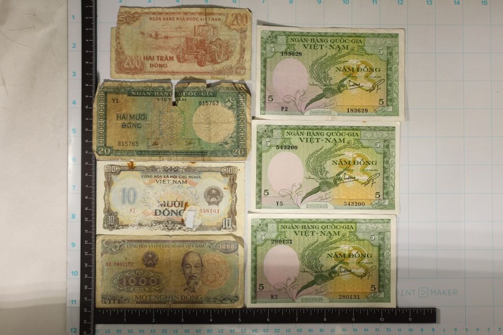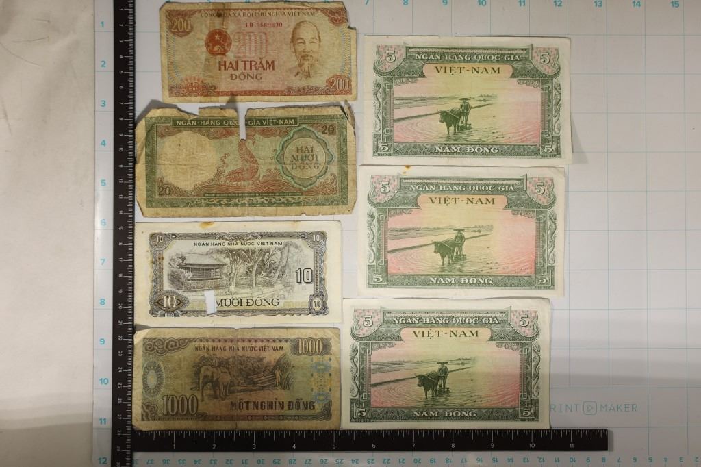 DONG, 200 DONG AND 1000 DONG. 3 OF THE BILLS HAVE HOLES, RIPS OR MISSING PIECES