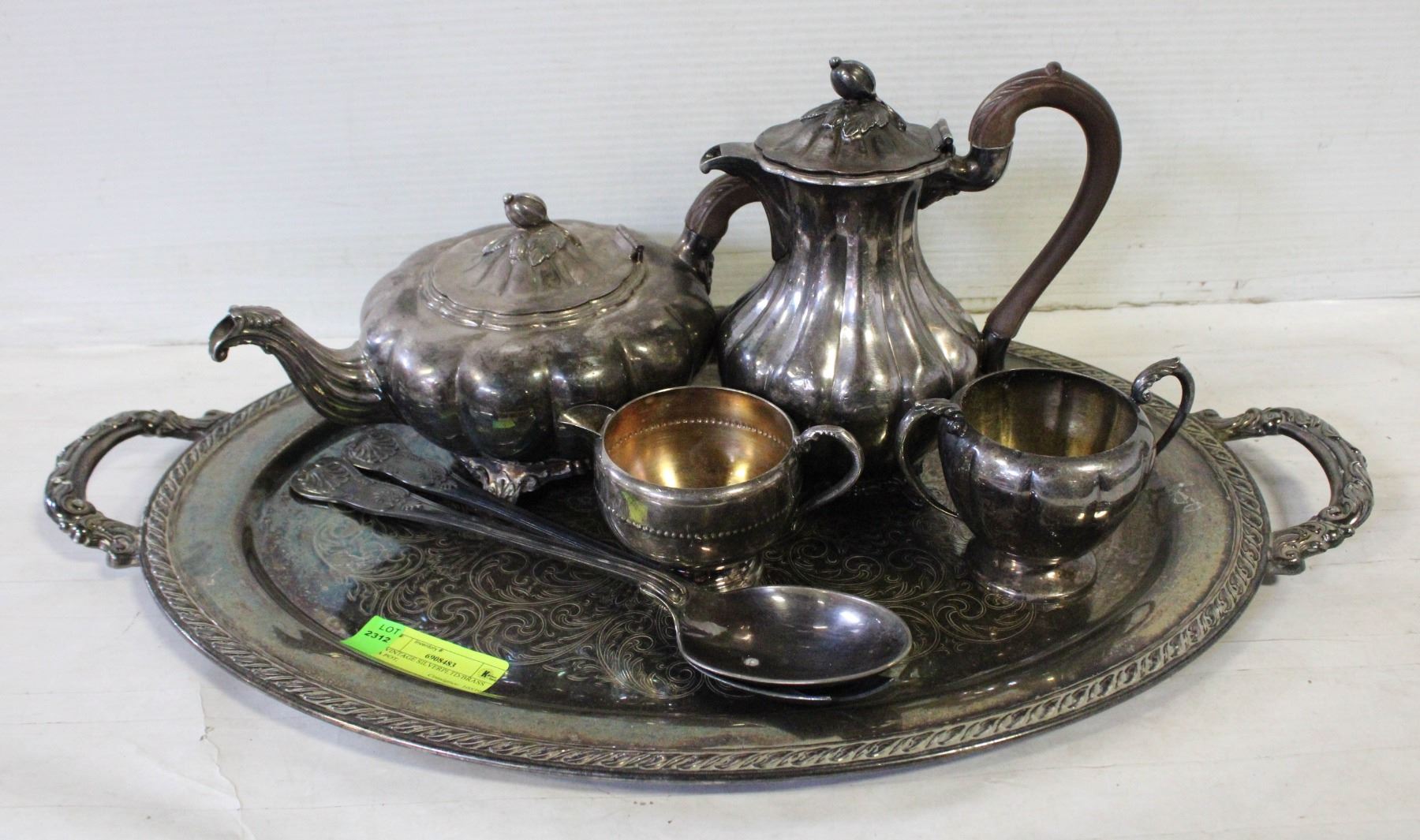 COFFEE POT, CREAM, SUGAR, TRAY, UTENSILS