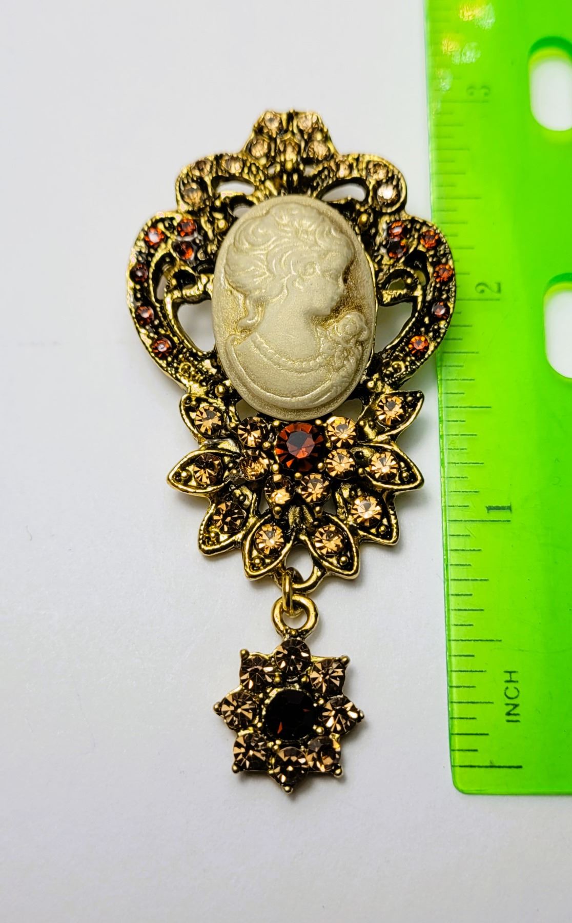 COLORED CAMEO SET IN A FILIGREE SETTING WITH CRYSTAL ACCENTS AND A FLOWER SHAPED DROP WITH A GARNET COLORED CRYSTAL. JEWELRY
