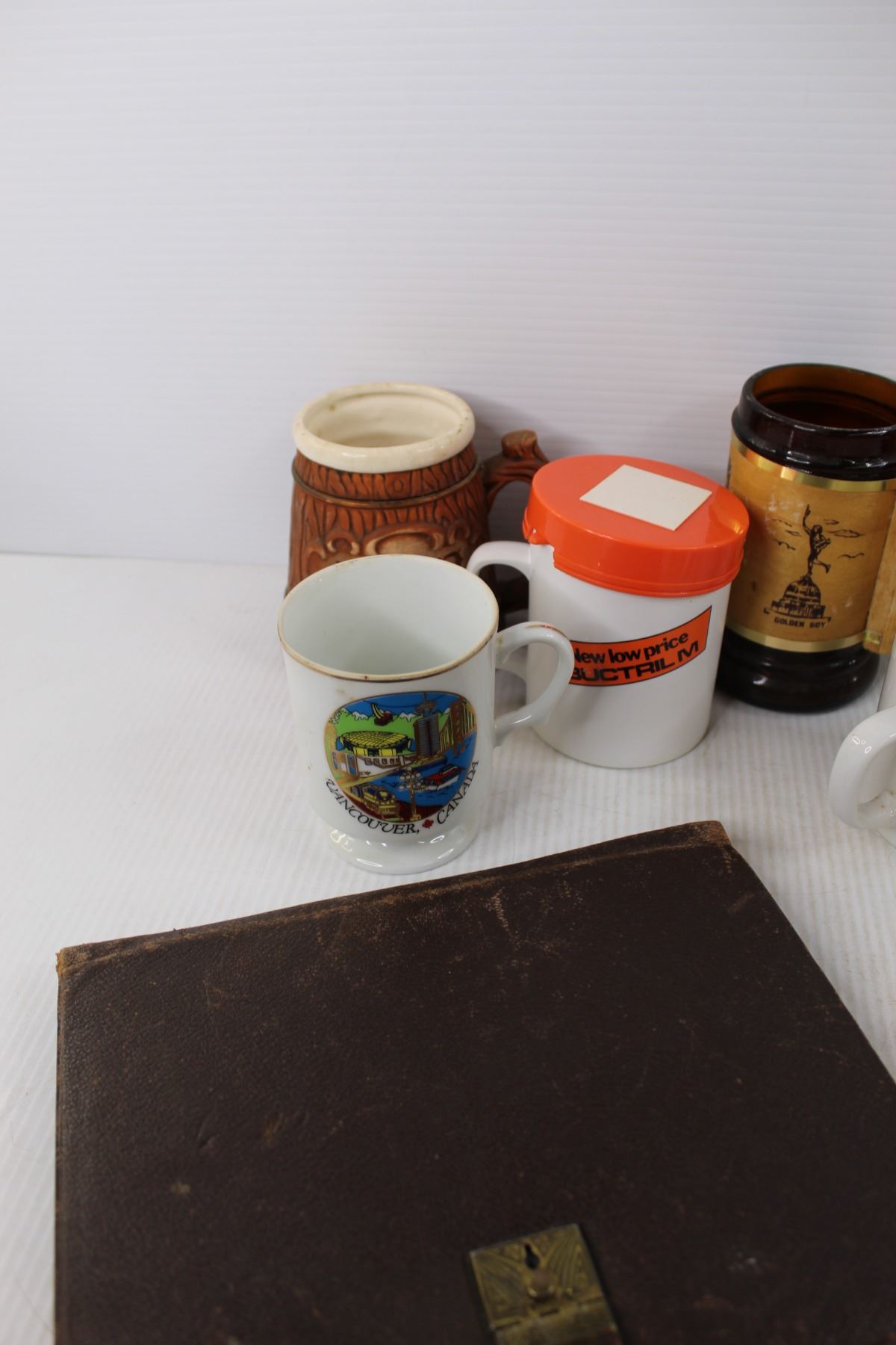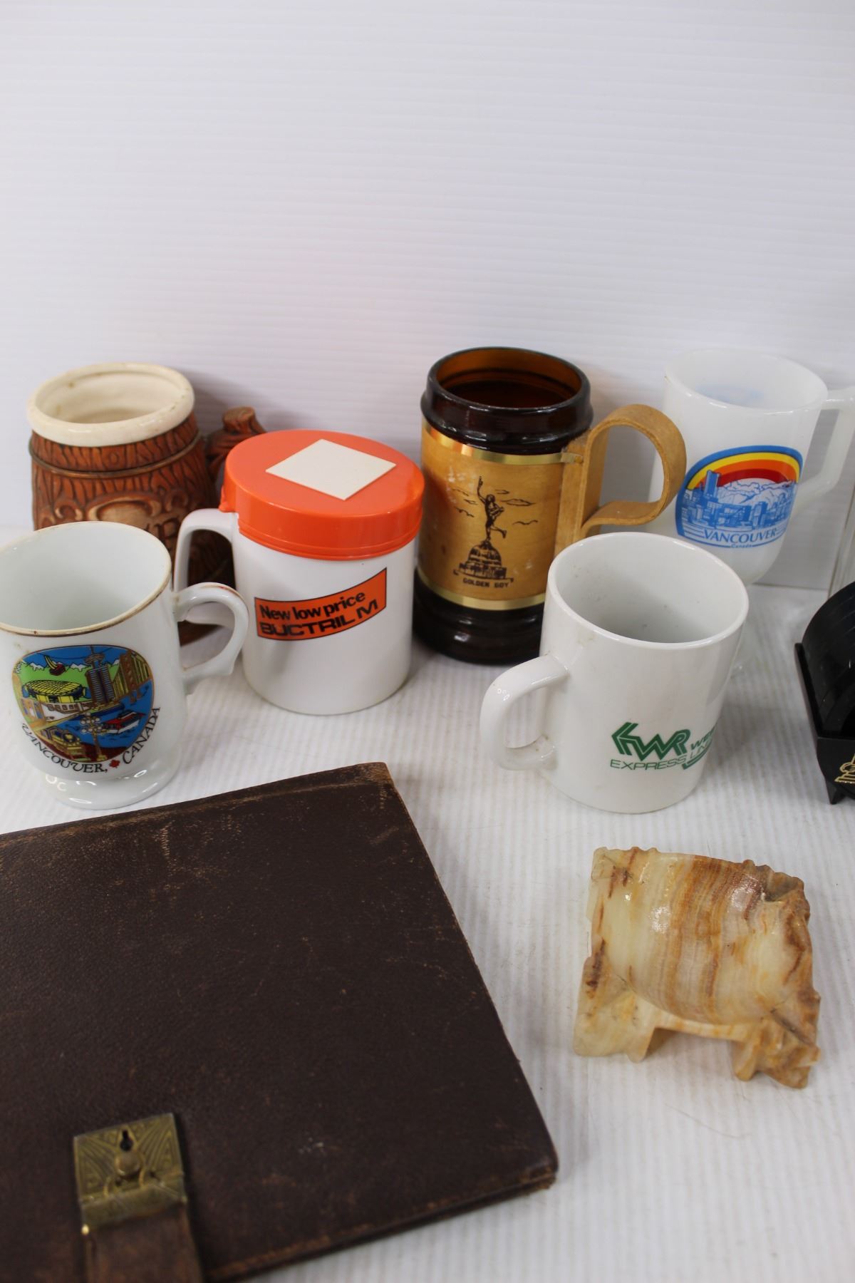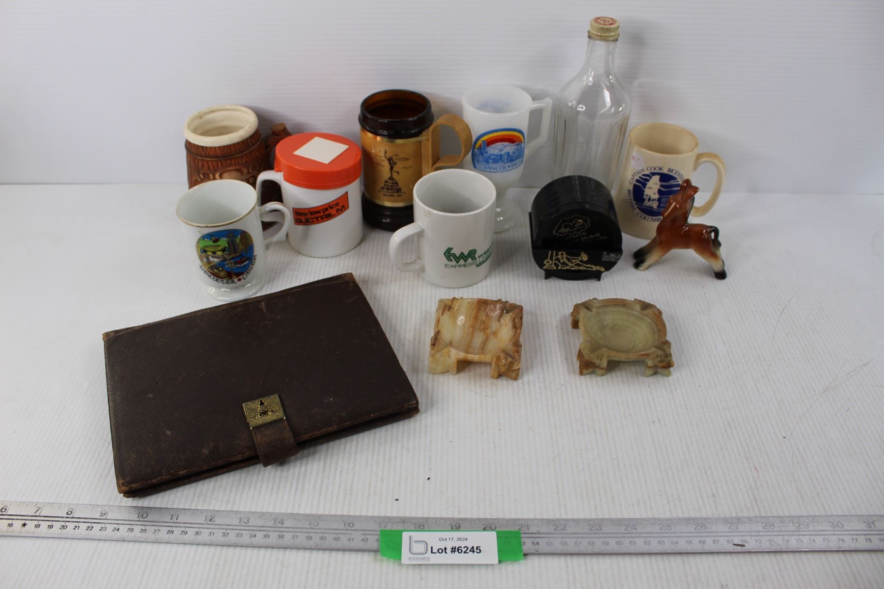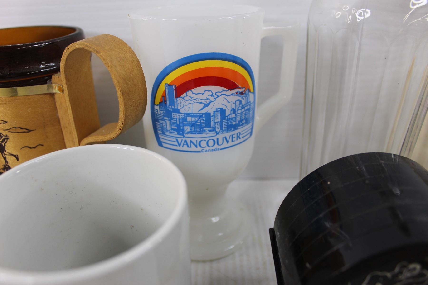 (7) Various Different Coffee Cups- Captain Cook, Vancouver, Beer Steins, Heinz 57 Bottle, Coasters, Leather Folder, Misc.