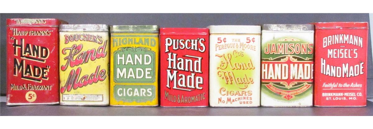 Seven Various "Hand Made" Cigar Tins for 25 Cigars. Hauptmann's, fair condition. Brinkman Meisel's, good condition. Pusch's, near mint. Jamison's, good condition. Highland, good condition. Peregoy & Moore Co., near mint. Boucher's embossed tin in fair condition.