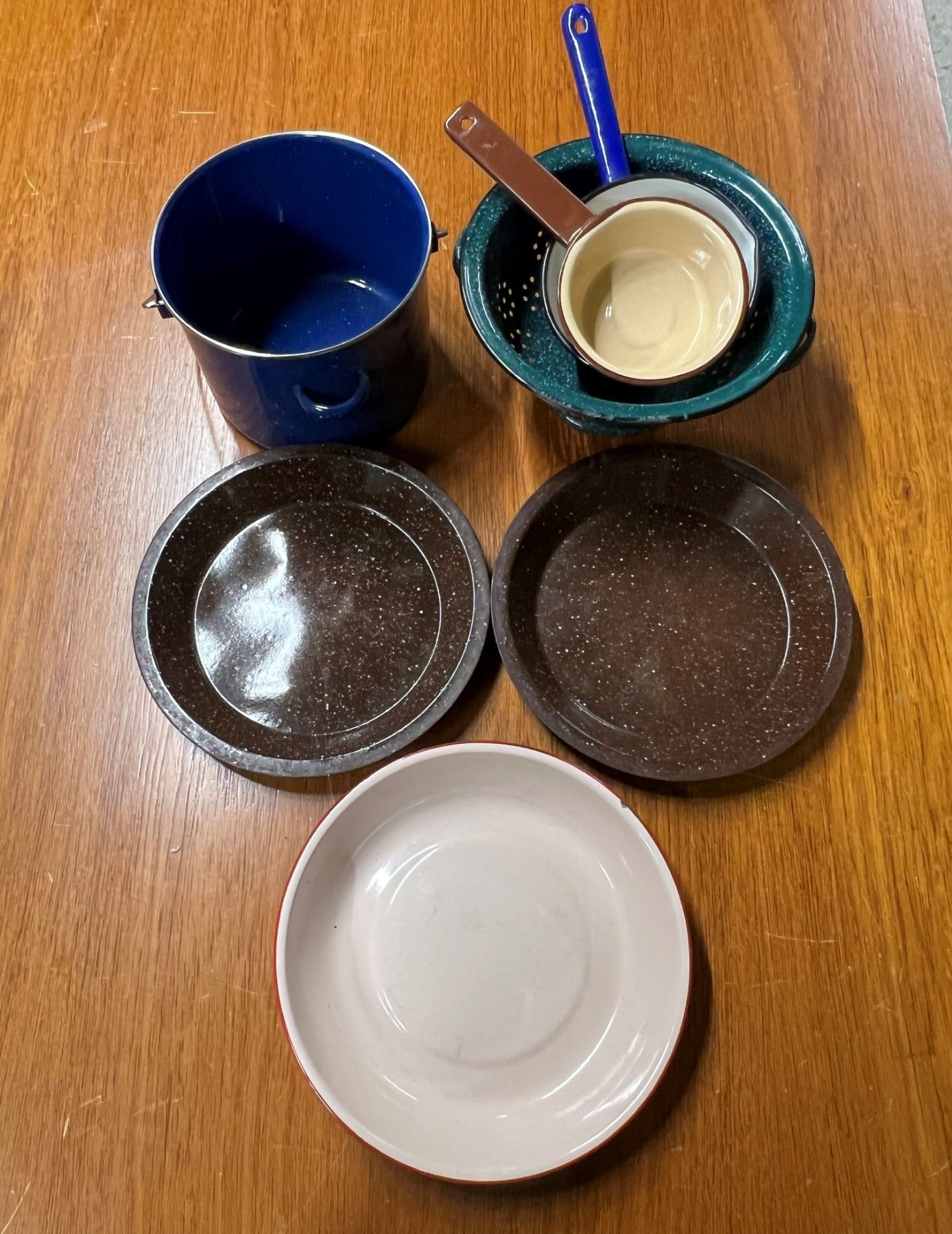 7 Vintage Metal / Enamel Pots Pie plates Strainer etc