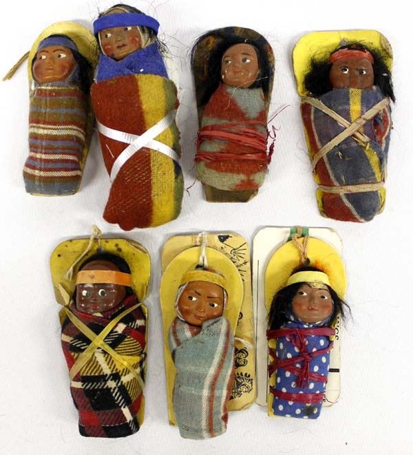 7 Vintage Skookum Mailer Dolls, largest measures 2''W x 4.5''L, two have the original mailing labels (one is written on)