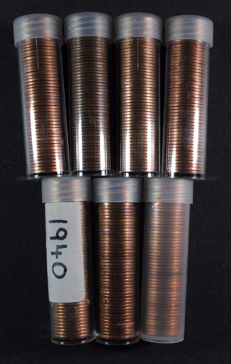 7 - WHEAT CENT ROLLS; 1936, 1937, 1940 CIRC, 2-1945 AU/BU, 1946 & 1948 XF/AU