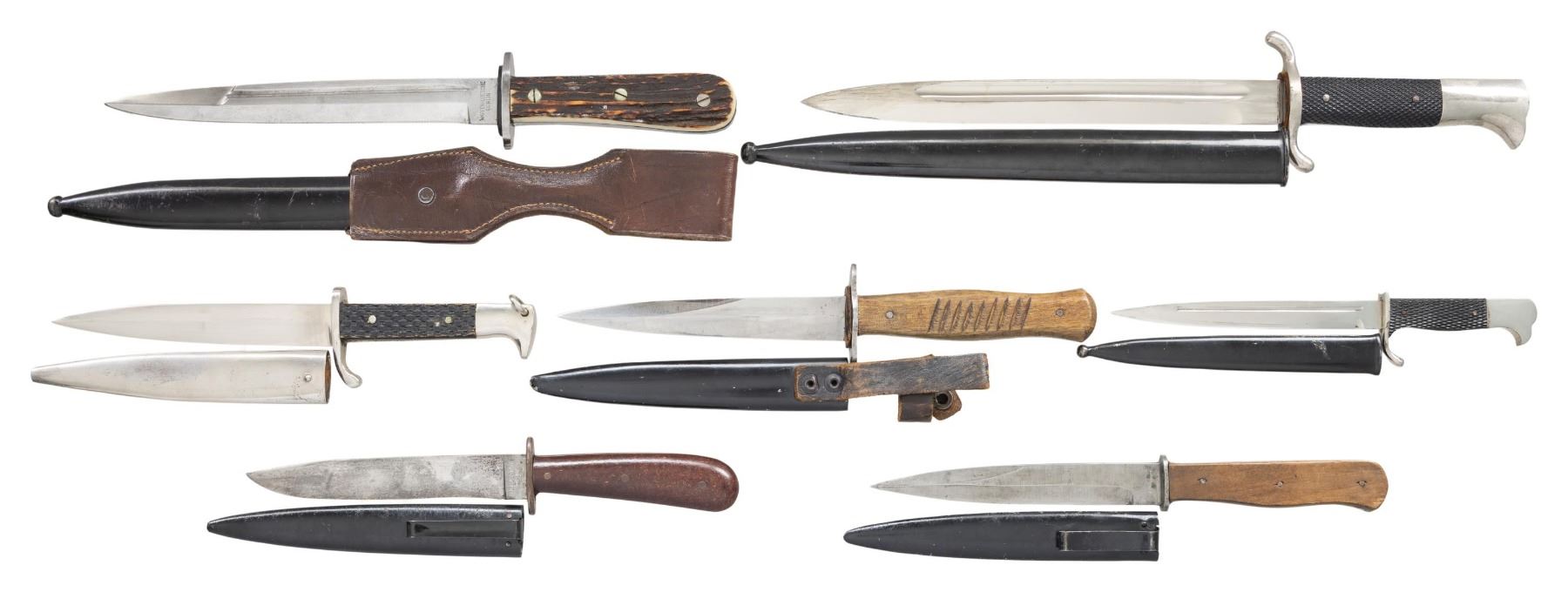 7 WWII GERMAN BAYONETS & BOOT OR FIGHTING KNIVES.