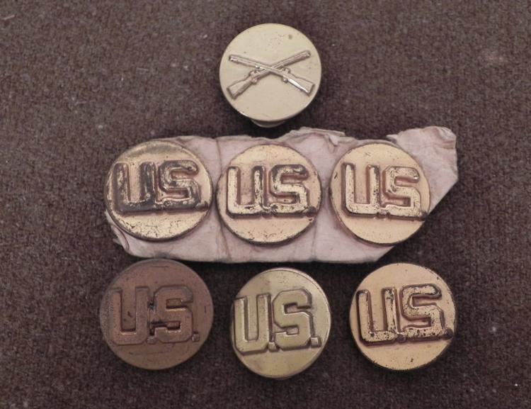 7 WWII U/S/ AND INFANTRY COLLAR BRASSMOST HAVE CRIMP BACK ATTACHMENTS