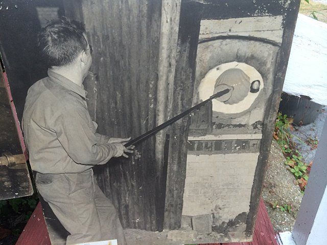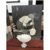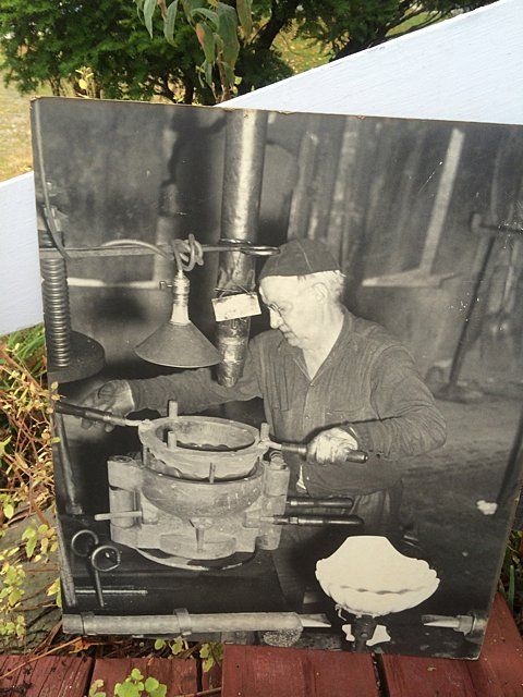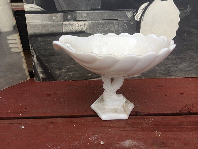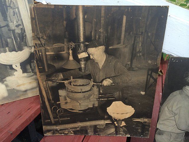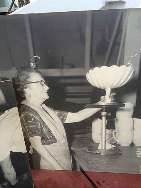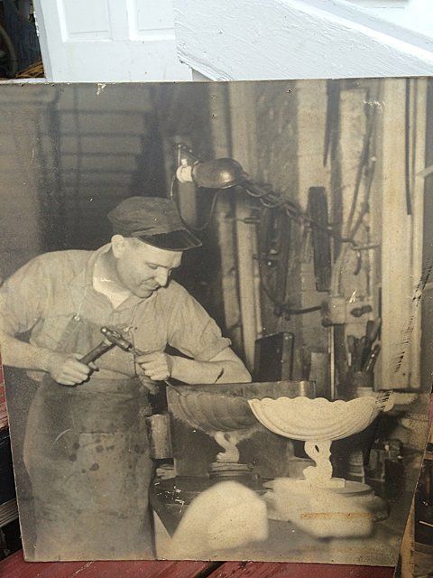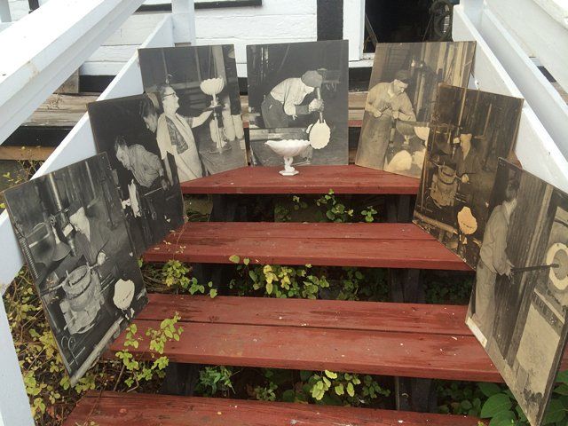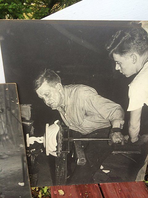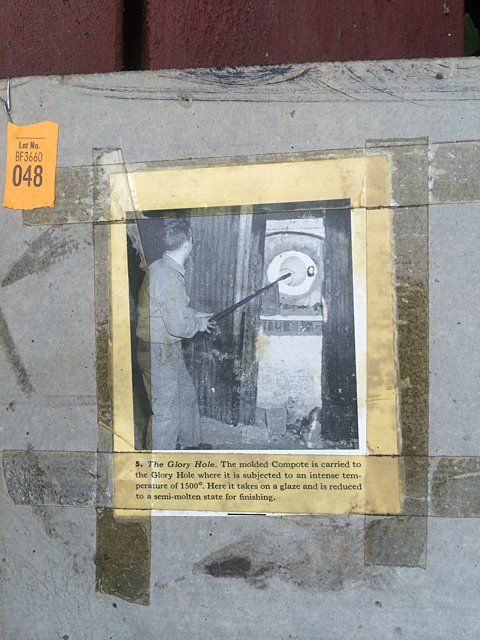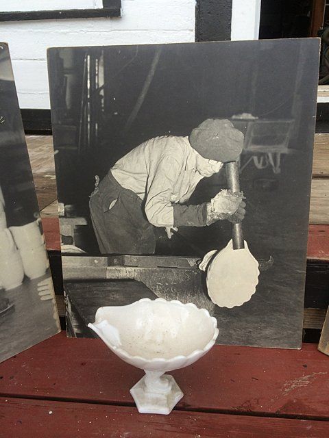 7 Westmoreland Glass Company display photos, black and white, mounted, measuring 23 1/2" wide x 20 1/4" tall each. These are vintage photos of the glass making process for a specific compote and were hung with pride within the Westmoreland Glass factory. A fabulous find and wonderful representation of glass making history. Also included is the milk glass compote that matches the piece depicted in the photographs. Each display photo has an explanation of the process depicted on the back.