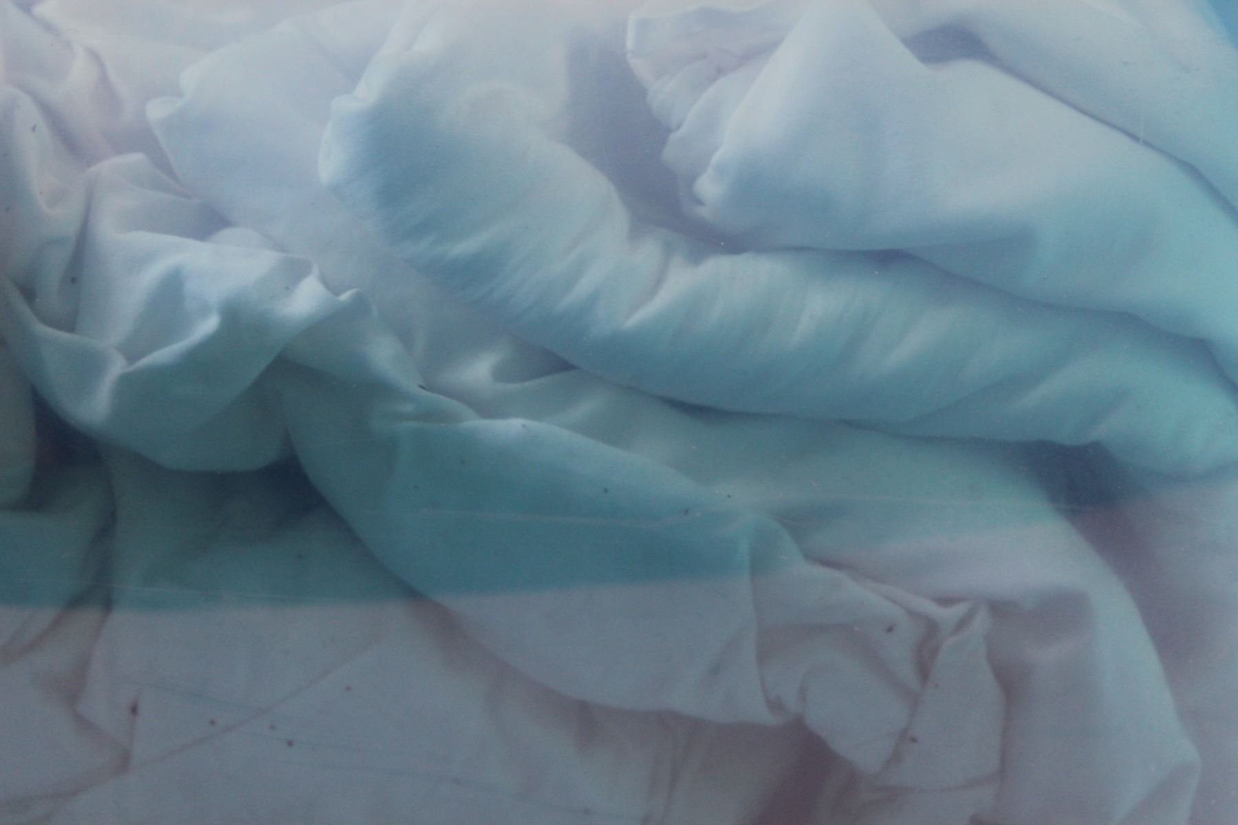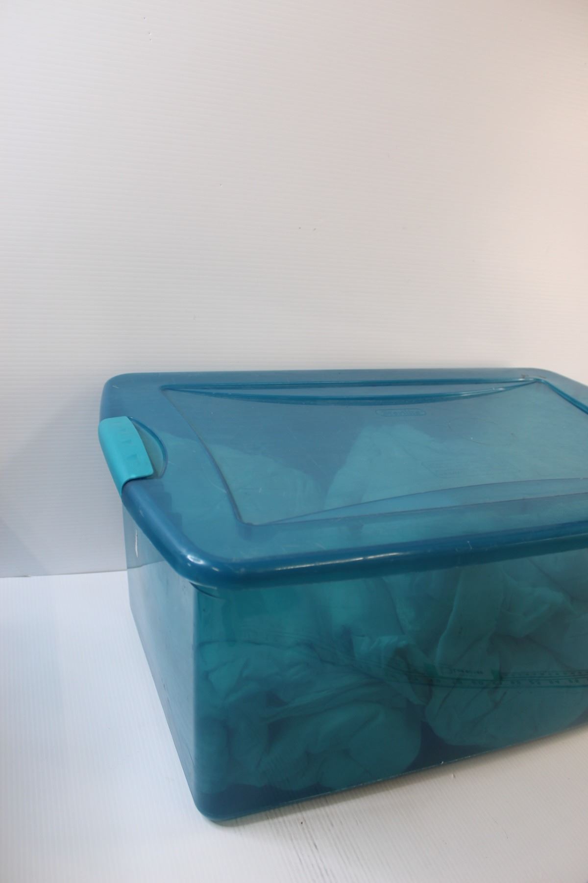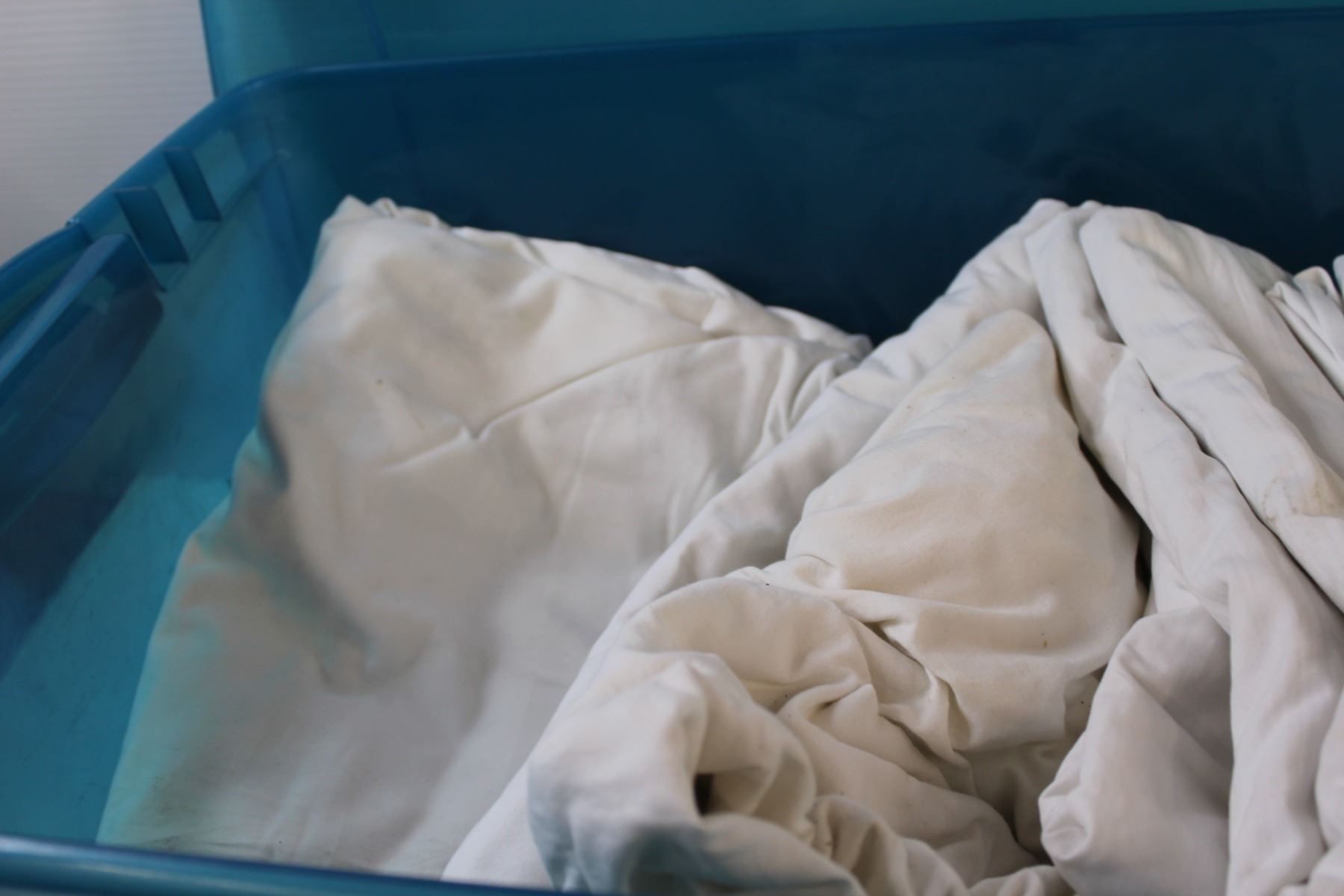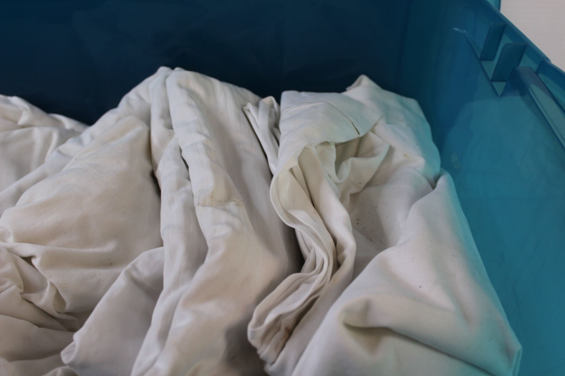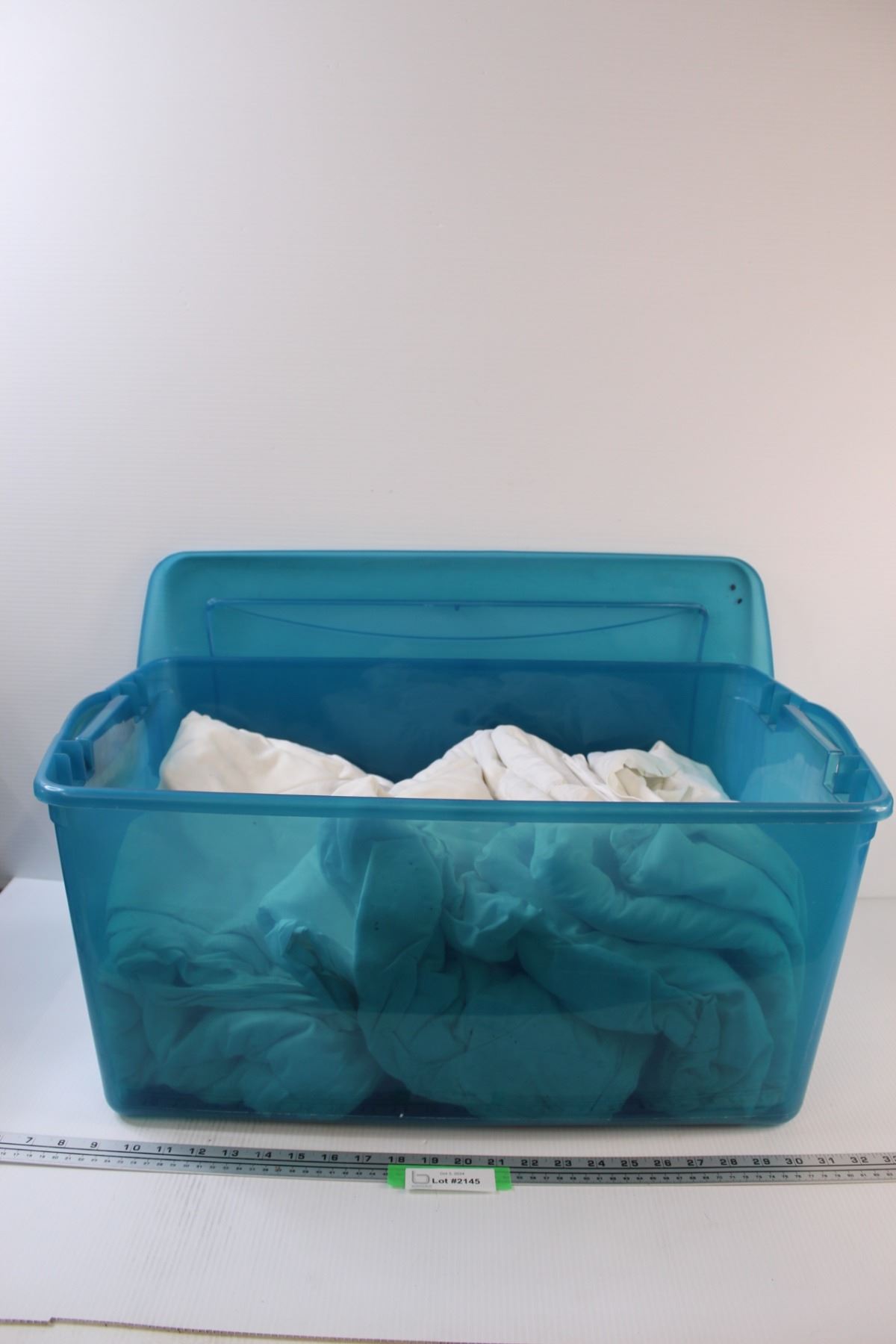 (7) White Flat Sheets in Blue Tote w/Lid - Assorted Sheets Sizes