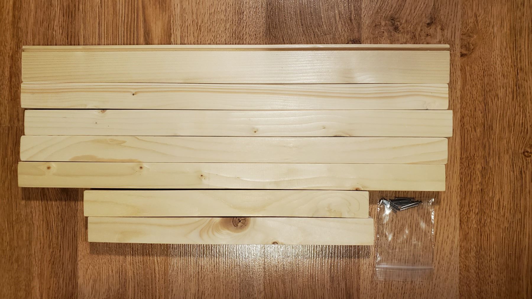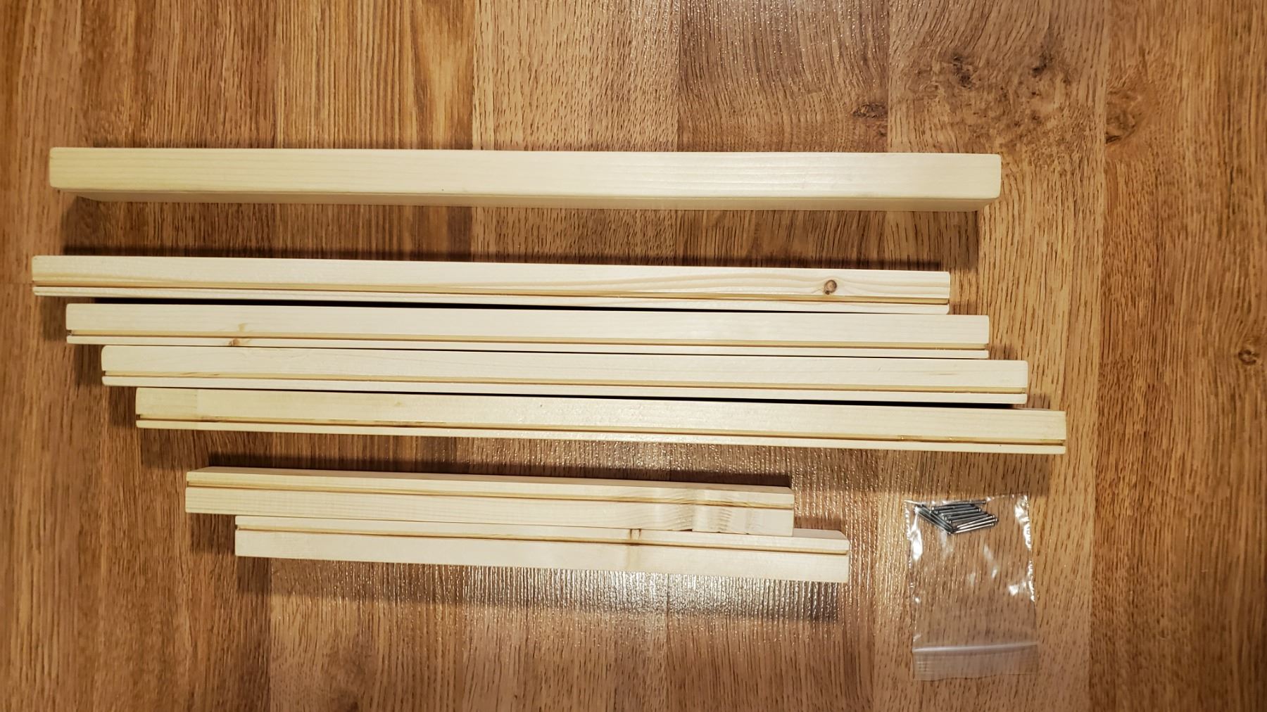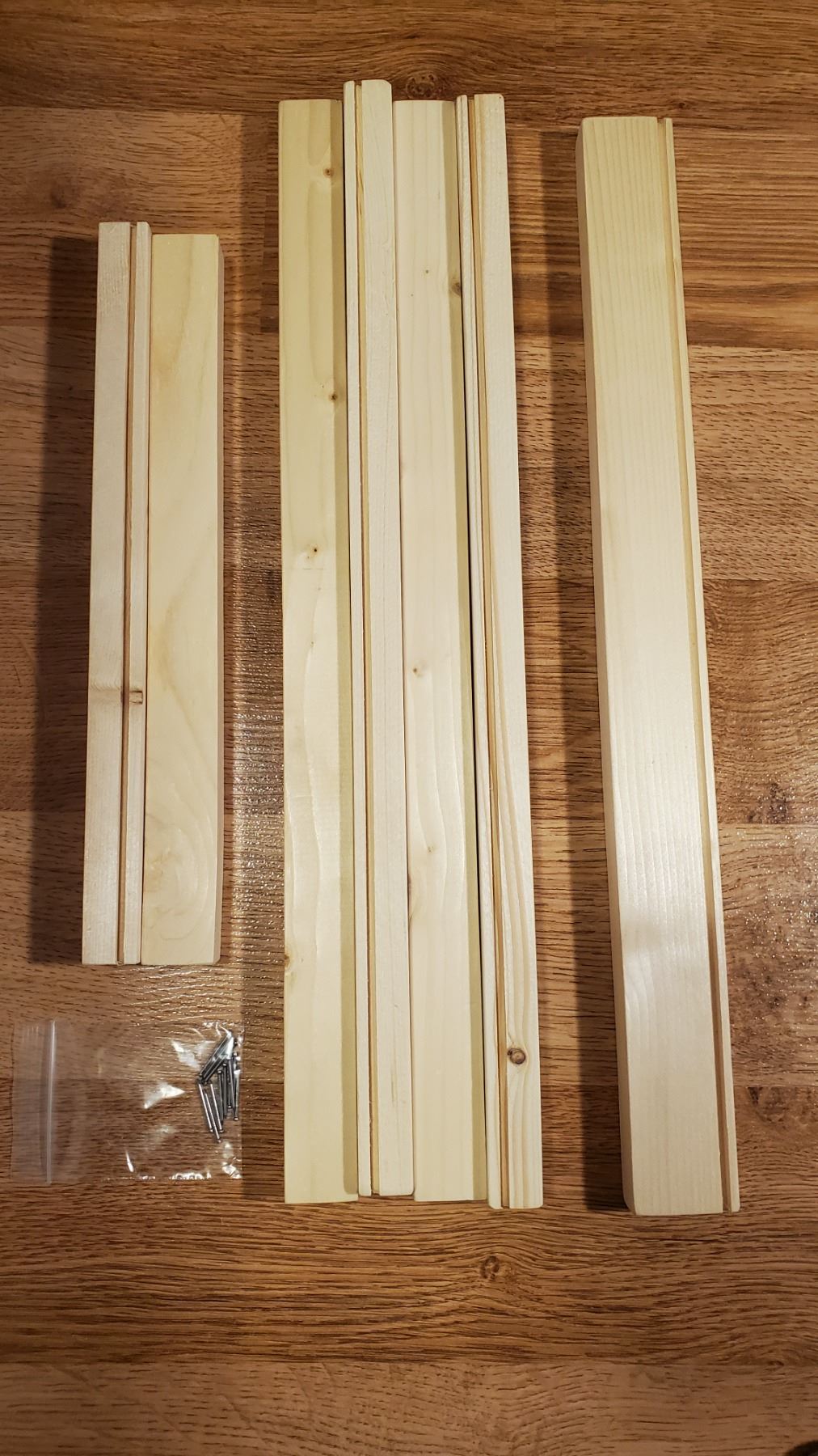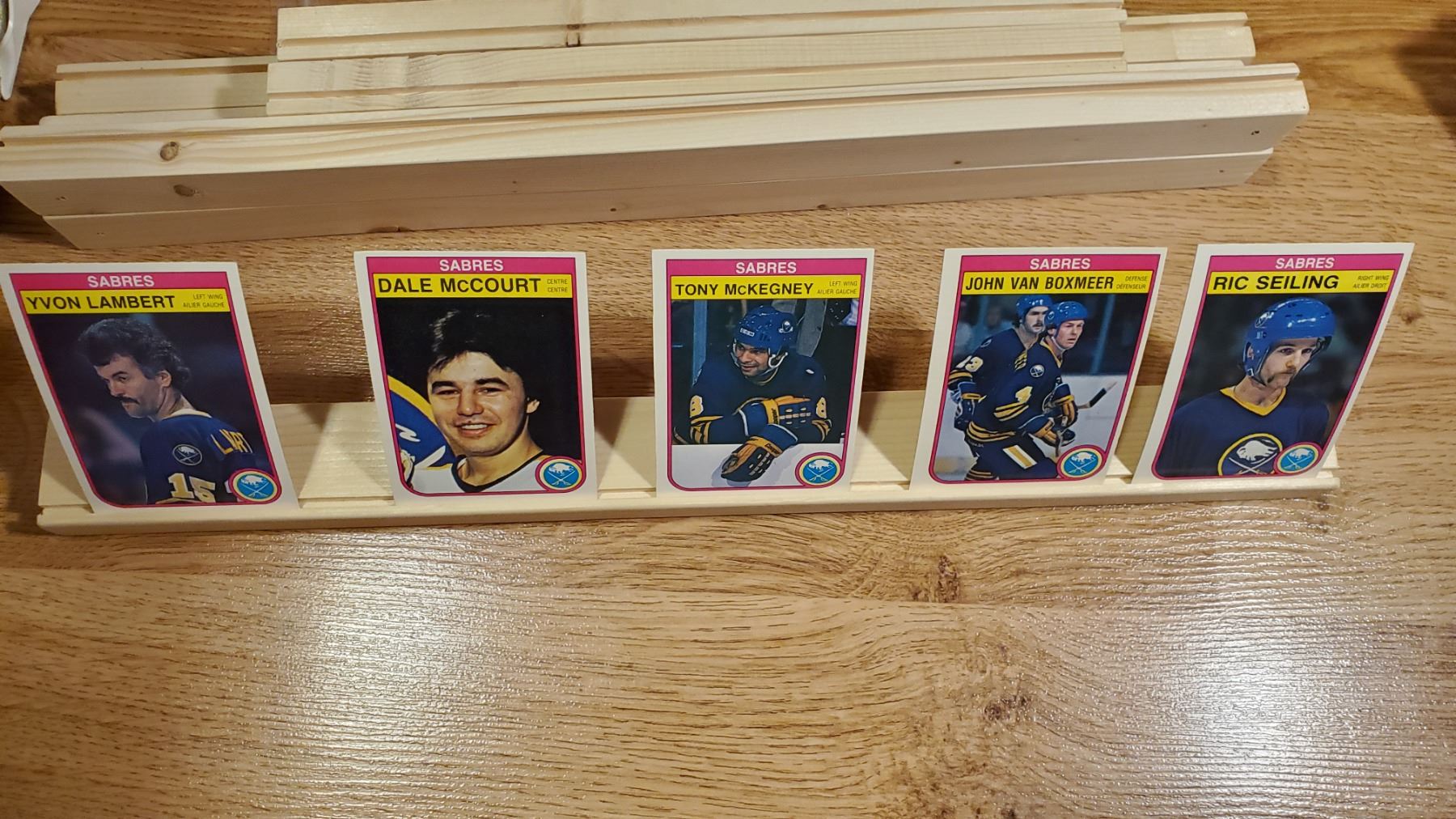 grooved top, less than 1" thick, easy to mount - comes with 12 nails that easily press into the wall - 5 of the stands display 5 cards in plastic toploaders, and 2 will display 3 cards