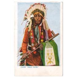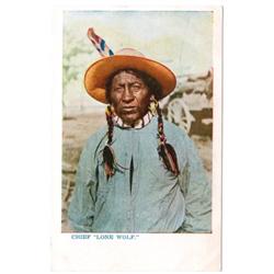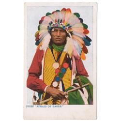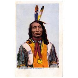 1) Chief 'Bear Goes in the Wood." A fine example with applied glitter. Postally sent. [4-] 2) Chief 'Afraid of Eagle.' 3) Chief 'Little White Cloud." 4) Chief "Skin Cote." Surface abrasion. [D2] 5) Chief 'Lone Wolf." 6) Chief "Yellow Hair." 7) Chief "Fleet Foot." This last postally used with cancellation marks [2-]. Those with no condition card are [3]