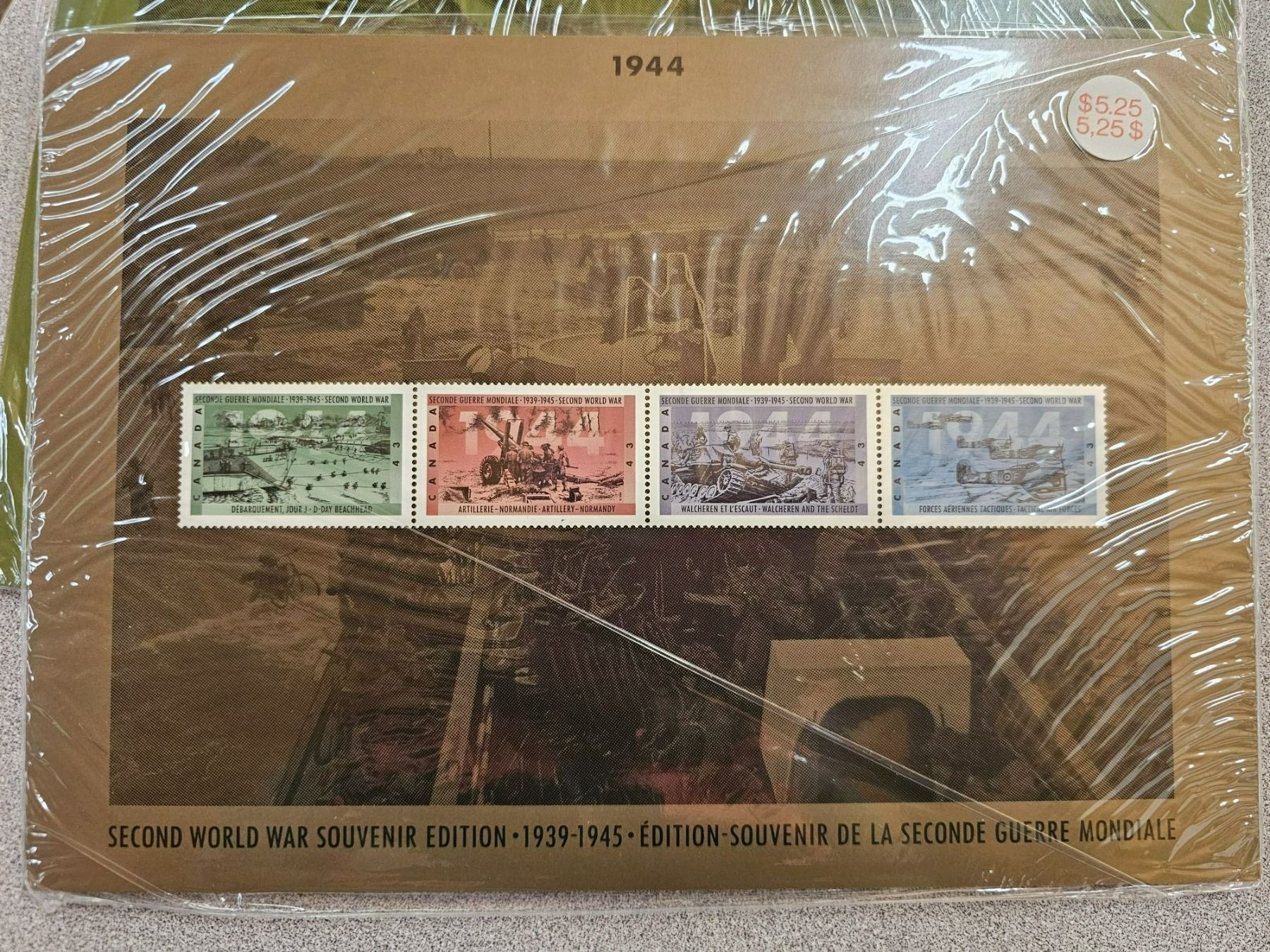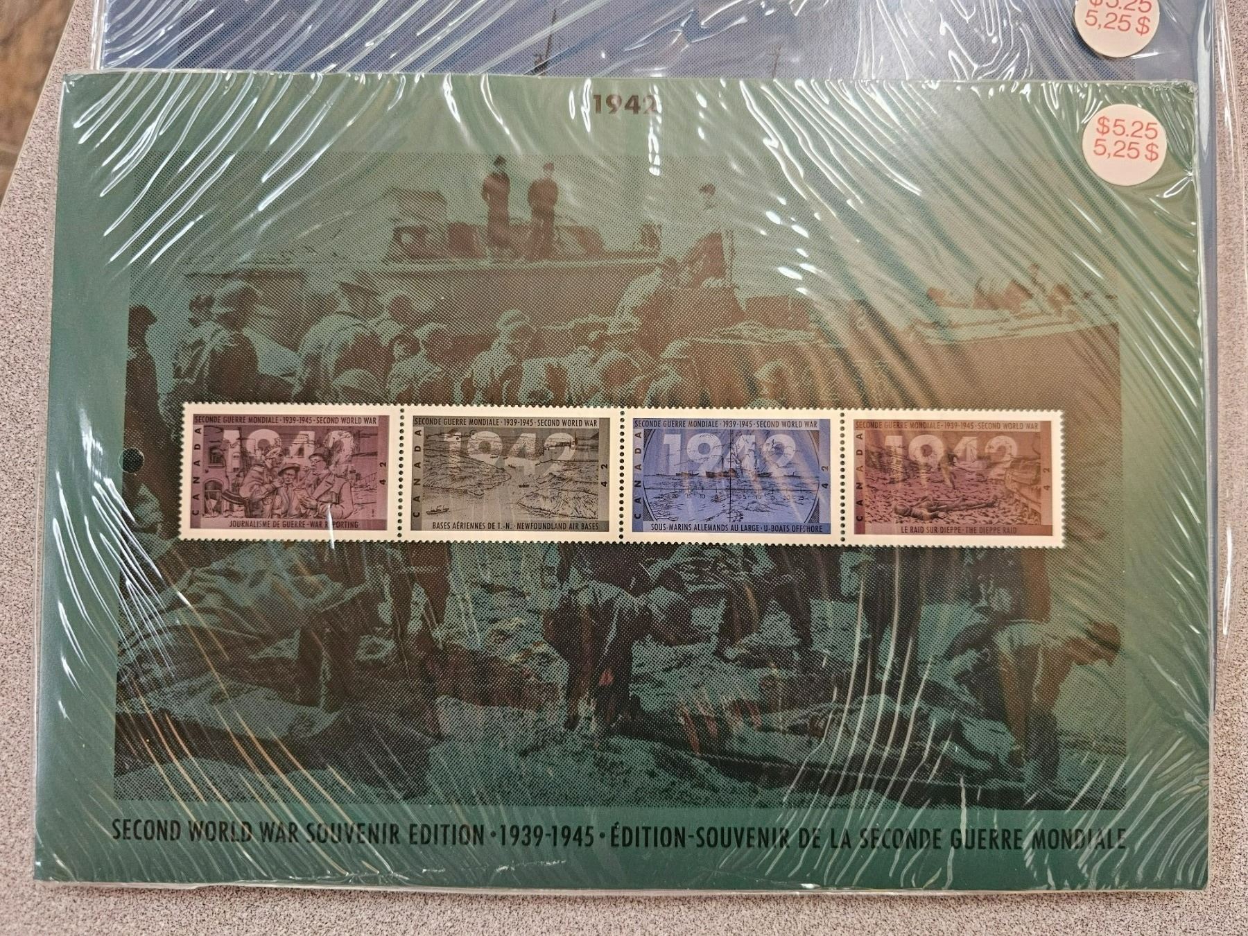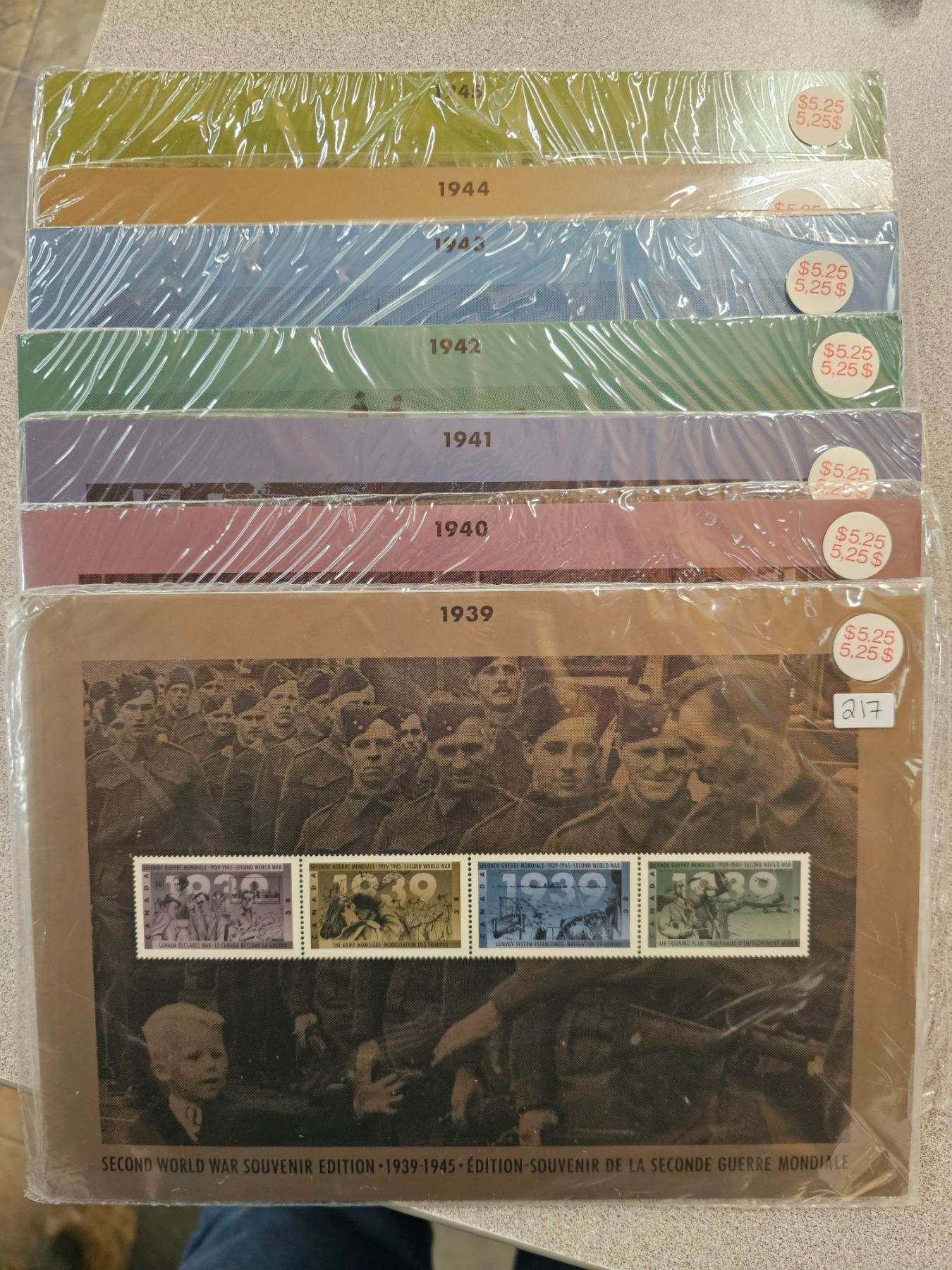 7 complete sets of Canadian Stamps to commemorate Canada during World War II. 1939, 1940, 1941, 1942, 1943, 1944, & 1945. All Second World War Souvenir Edition stamps. As issued by Canada Post. All 7 sets are unopened & Mint.